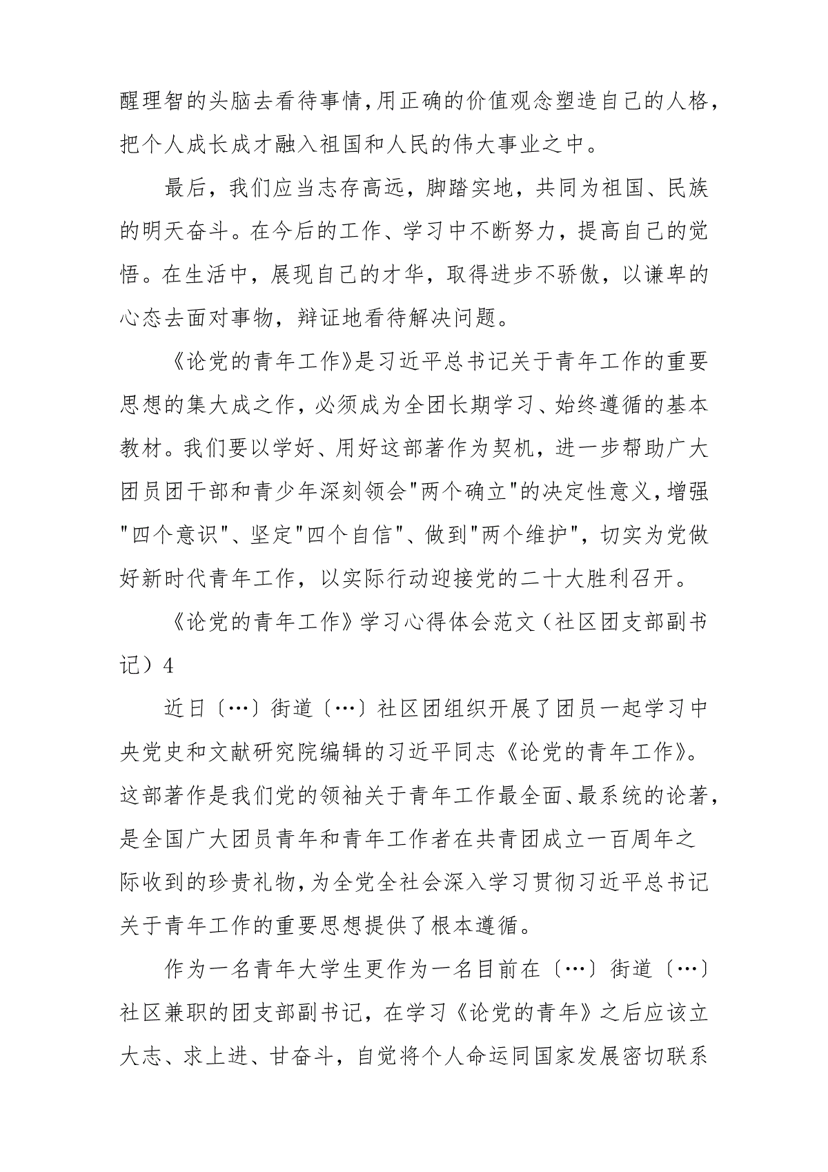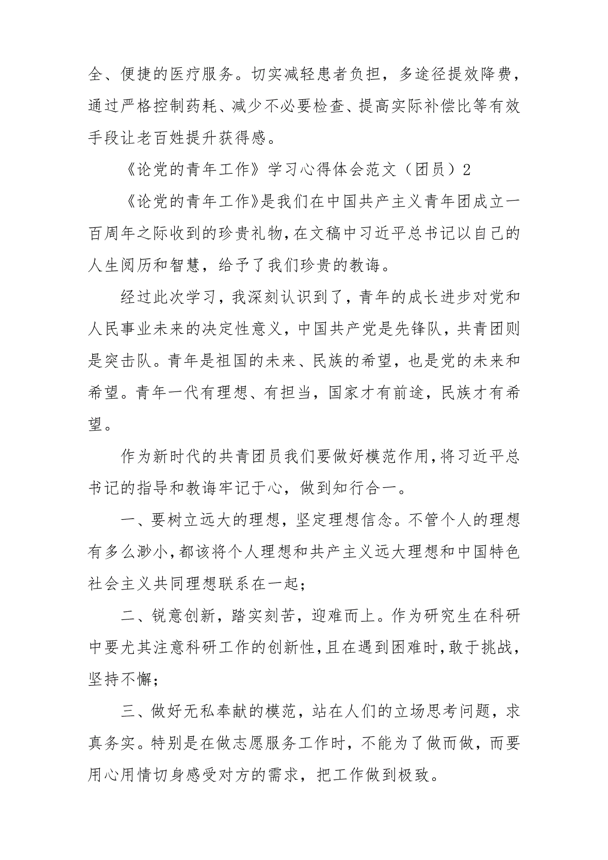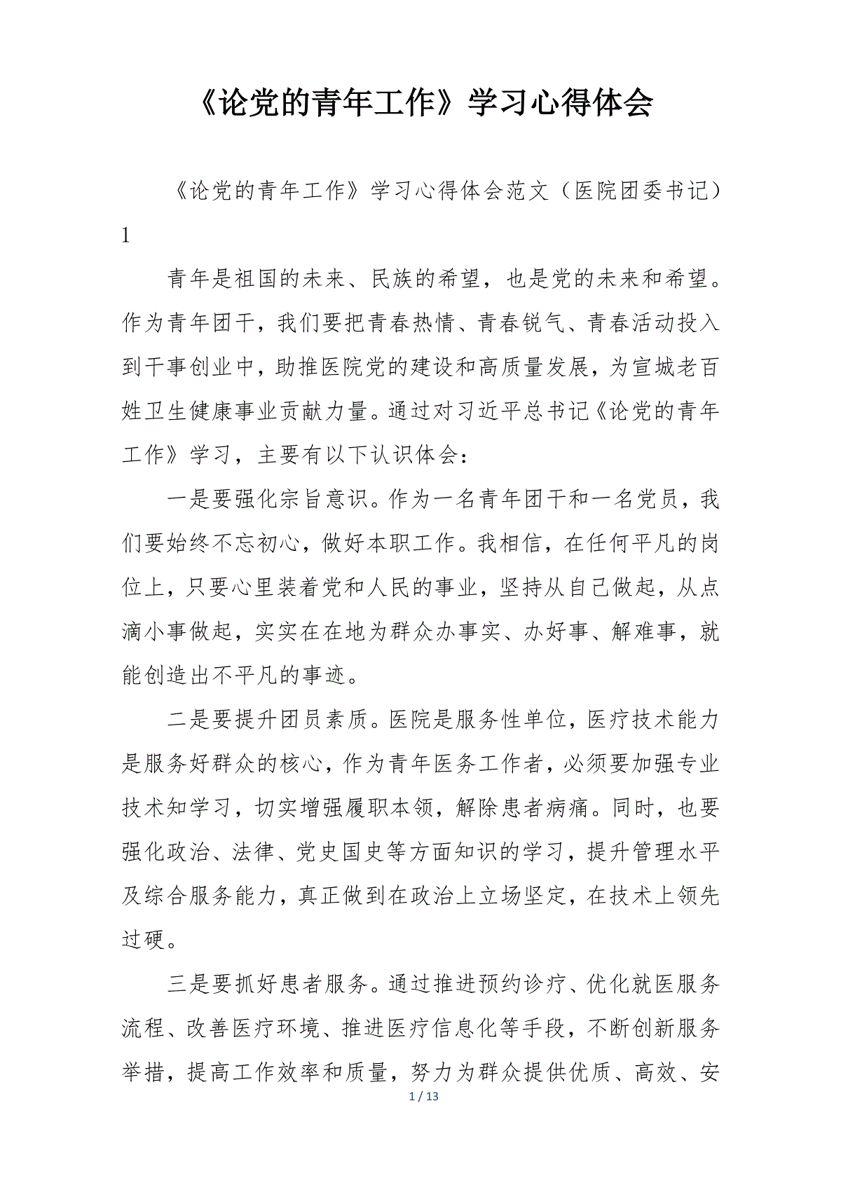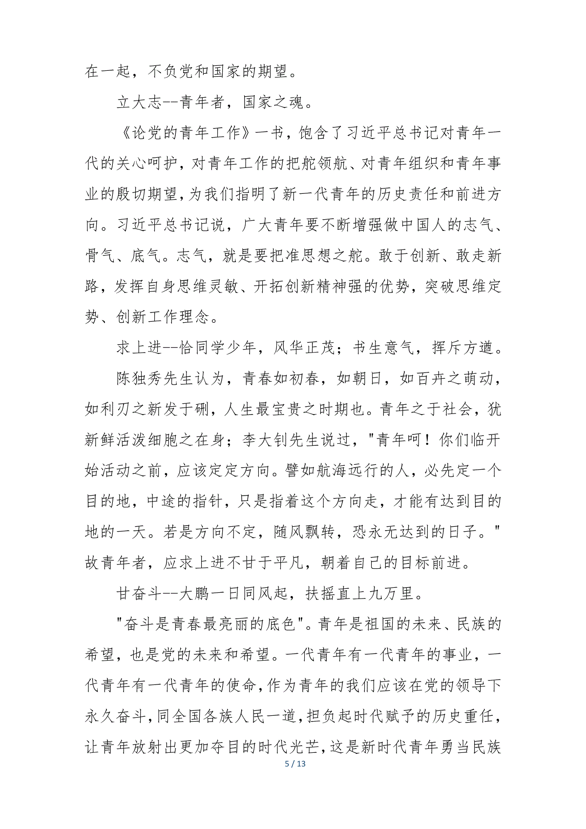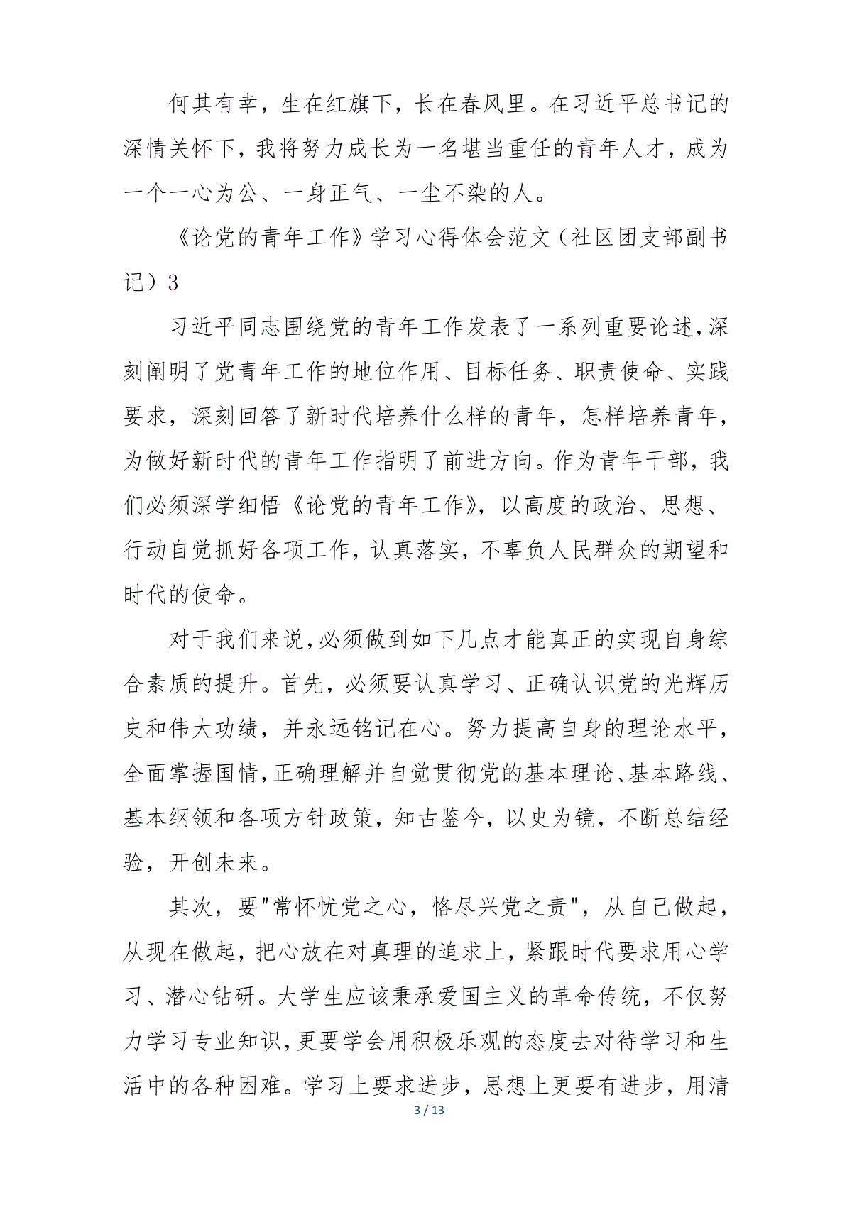 1/13《论党的青年工作》学习心得体会《论党的青年工作》学习心得体会范文(医院团委书记)1青年是祖国的未来、民族的希望,也是党的未来和希望。作为青年团干,我们要把青春热情、青春锐气、青春活动投入到干事创业中,助推医院党的建设和高质量发展,为宣城老百姓卫生健康事业贡献力量。通过对习近平总书记《论党的青年工作》学习,主要有以下认识体会:一是要强化宗旨意识。作为一名青年团干和一名党员,我们要始终不忘初心,做好本职工作。我相信,在任何平凡的岗位上,只要心里装着党和人民的事业,坚持从自己做起,从点滴小事做起,实实在在地为群众办事实、办好事、解难事,就能创造出不平凡的事迹。二是要提升团员素质。医院是服务性单位,医疗技术能力是服务好群众的核心,作为青年医务工作者,必须要加强专业技术知学习,切实增强履职本领,解除患者病痛。同时,也要强化政治、法律、党史国史等方面知识的学习,提升管理水平及综合服务能力,真正做到在政治上立场坚定,在技术上领先过硬。三是要抓好患者服务。通过推进预约诊疗、优化就医服务流程、改善医疗环境、推进医疗信息化等手段,不断创新服务举措,提高工作效率和质量,努力为群众提供优质、高效、安全、便捷的医疗服务。切实减轻患者负担,多途径提效降费,通过严格控制药耗、减少不必要检查、提高实际补偿比等有效手段让老百姓提升获得感。《论党的青年工作》学习心得体会范文(团员)2《论党的青年工作》是我们在中国共产主义青年团成立一百周年之际收到的珍贵礼物,在文稿中习近平总书记以自己的人生阅历和智慧,给予了我们珍贵的教诲。经过此次学习,我深刻认识到了,青年的成长进步对党和人民事业未来的决定性意义,中国共产党是先锋队,共青团则是突击队。青年是祖国的未来、民族的希望,也是党的未来和希望。青年一代有理想、有担当,国家才有前途,民族才有希望。作为新时代的共青团员我们要做好模范作用,将习近平总书记的指导和教诲牢记于心,做到知行合一。一、要树立远大的理想,坚定理想信念。不管个人的理想有多么渺小,都该将个人理想和共产主义远大理想和中国特色社会主义共同理想联系在一起;二、锐意创新,踏实刻苦,迎难而上。作为研究生在科研中要尤其注意科研工作的创新性,且在遇到困难时,敢于挑战,坚持不懈;三、做好无私奉献的模范,站在人们的立场思考问题,求真务实。特别是在做志愿服务工作时,不能为了做而做,而要用心用情切身感受对方的需求,把工作做到极致。3/13何其有幸,生在红旗下,长在春风里。在习近平总书记的深情关怀下,我将努力成长为一名堪当重任的青年人才,成为一个一心为公、一身正气、一尘不染的人。《论党的青年工作》学习心得体会范文(社区团支部副书记)3习近平同志围绕党的青年工作发表了一系列重要论述,深刻阐明了党青年工作的地位作用、目标任务、职责使命、实践要求,深刻回答了新时代培养什么样的青年,怎样培养青年,为做好新时代的青年工作指明了前进方向。作为青年干部,我们必须深学细悟《论党的青年工作》,以高度的政治、思想、行动自觉抓好各项工作,认真落实,不辜负人民群众的期望和时代的使命。对于我们来说,必须做到如下几点才能真正的实现自身综合素质的提升。首先,必须要认真学习、正确认识党的光辉历史和伟大功绩,并永远铭记在心。努力提高自身的理论水平,全面掌握国情,正确理解并自觉贯彻党的基本理论、基本路线、基本纲领和各项方针政策,知古鉴今,以史为镜,不断总结经验,开创未来。其次,要常怀忧党之心,恪尽兴党之责,从自己做起,从现在做起,把心放在对真理的追求上,紧跟时代要求用心学习、潜心钻研。大学生应该秉承爱国主义的革命传统,不仅努力学习专业知识,更要学会用积极乐观的态度去对待学习和生活中的各种困难。学习上要求进步,思想上更要有进步,用清醒理智的头脑去看待事情,用正确的价值观念塑造自己的人格,把个人成长成才融入祖国和人民的伟大事业之中。最后,我们应当志存高远,脚踏实地,共同为祖国、民族的明天奋斗。在今后的工作、学习中不断努力,提高自己的觉悟。在生活中,展现自己的才华,取得进步不骄傲,以谦卑的心态去面对事物,辩证地看待解决问题。《论党的青年工作》是习近平总书记关于青年工作的重要思想的集大成之作,必须成为全团长期学习、始终遵循的基本教材。我们要以学好、用好这部著作为契机,进一步帮助广大团员团干部和青少年深刻领会两个确立的决定性意义,增强四个意识、坚定四个自信、做到两个维护,切实为党做好新时代青年工作,以实际行动迎接党的二十大胜利召开。《论党的青年工作》学习心得体会范文(社区团支部副书记)4近日〔…〕街道〔…〕社区团组织开展了团员一起学习中央党史和文献研究院编辑的习近平同志《论党的青年工作》。这部著作是我们党的领袖关于青年工作最全面、最系统的论著,是全国广大团员青年和青年工作者在共青团成立一百周年之际收到的珍贵礼物,为全党全社会深入学习贯彻习近平总书记关于青年工作的重要思想提供了根本遵循。作为一名青年大学生更作为一名目前在〔…〕街道〔…〕社区兼职的团支部副书记,在学习《论党的青年》之