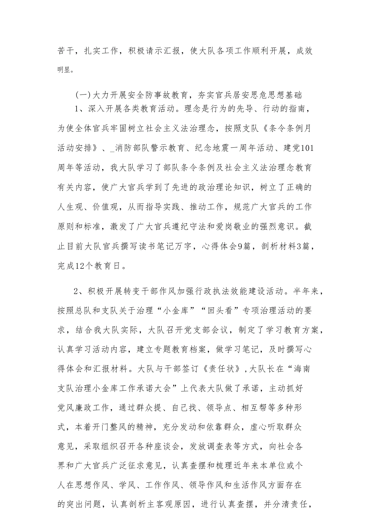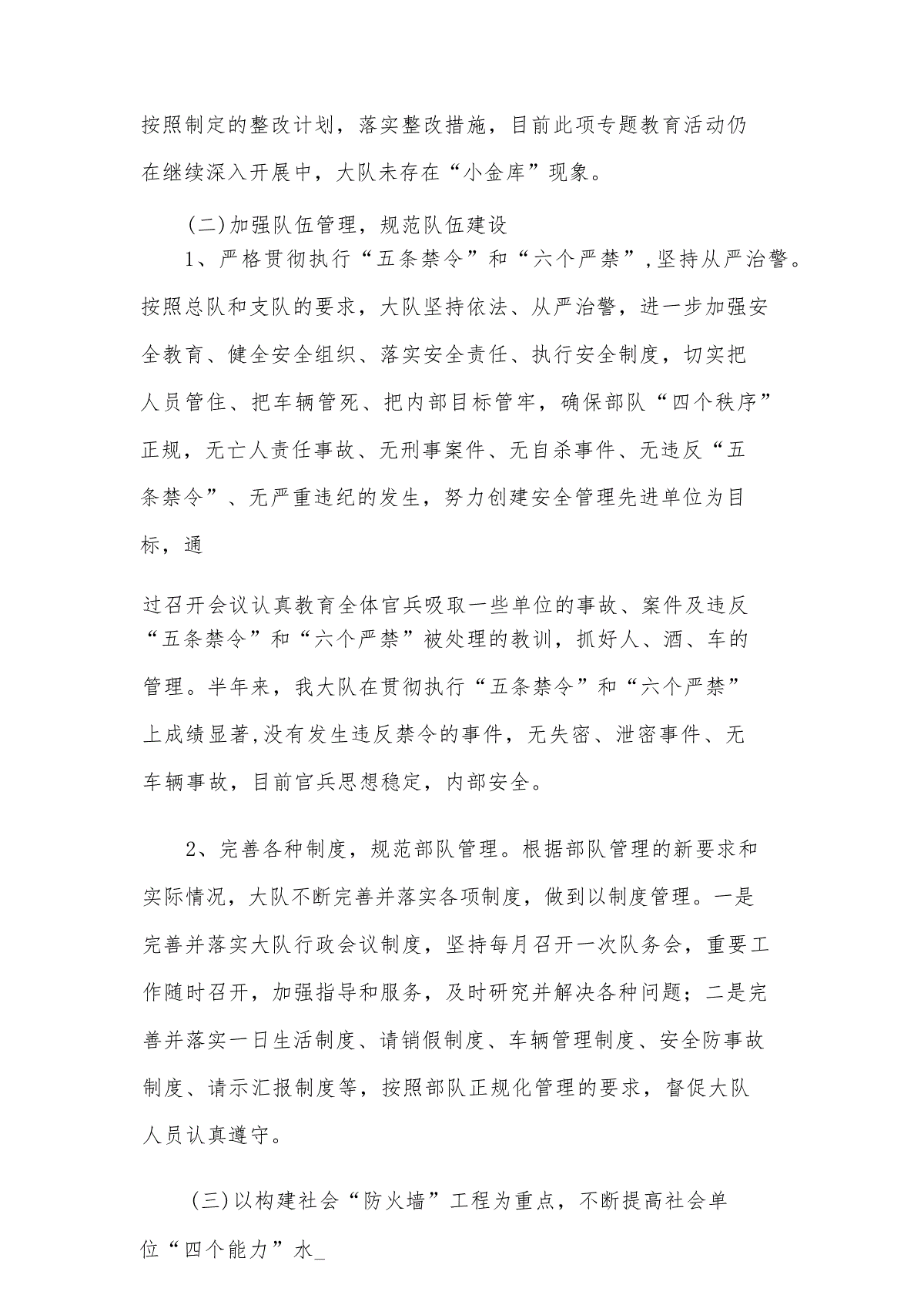 交通大队工作总结(6篇)交通大队工作总结篇1一、加强组织领导,提高思想认识。为全力做好辖区道路交通安全管理工作,大队及时组织召开专题会议,认真分析研判辖区道路交通安全形势,对道路交通安全管理工作进行集中安排部署,要求各部门负责人明确工作目标、任务措施和具体要求。同时,大队要求全体民警、辅警要进一步加强思想认识,坚决克服麻痹大意思想,为创建一个和谐、畅通的春运交通环境筑牢思想防线,全力投入到道路交通安全管理工作中。二、加强沟通联系,健全协作机制。大队进一步加强与交通、安监等单位的沟通协作,按照“各司其职、各负其责,相互配合、整体联动”的原则,全面加强客运车辆的管理,以“三超一疲劳”、涉牌涉证、酒后驾驶等道路交通违法行为为重点,迅速掀起客运车辆违法交通整治高潮,构筑严密防线,全力预防和减少道路交通事故的发生。三、全面排查隐患,坚决落实整改。大队根据辖区道路交通实际,组织经验丰富的民警、辅警积极开展安全隐患排查工作。一是联合交通、安监等部门对辖区9座以上的客运车辆进行安全隐患排查,对于达到报废标准的报废车辆坚决予以强制报废,对于存在安全隐患的立即停止客运资格,进行整改,消除安全隐患后才允许上路。二是会同安监部门对辖区道路交通设施进行了细致排查,对排查出的安全隐患制定了相应的整治措施,落实整改责任,努力为即将到来的“春运”打下安全基础。四、加强宣传攻势,营造浓厚氛围。为配合此次客运车辆的管理工作,大队宣传民警、辅警深入辖区客运企业和客运场所,加强对客运驾驶人及客运企业负责人的宣传教育活动。通过发放宣传材料、安全手册、悬挂宣传标语,提醒广大客运车辆驾驶人自觉遵守交通安全法律法规,做到文明驾驶、安全出行,确保人民群众度过一个_安、和谐、愉快的新春佳节。交通大队工作总结篇2为认真梳理半年来我大队各项工作完成情况,为下一步工作做好科学决策和部署,现将有关工作总结如下:自3月份我大队参加完支队年工作会议以来,在支队党委和县委、县_正确领导下,县_局的大力支持和密切配合下,大队各项工作紧紧围绕年度重点工作目标任务,以全面构建社会单位“防火墙”工程为主线,以消防安全“五大”活动为抓手,在狠抓社会单位“四个能力”建设的同时,整体推进社会单位消防管理创新;以庆祝建党101周年活动为契机,全面建设人民满意的消防执法队伍为目标,积极开展大走访“开门评警”活动;以提高后勤综合保障能力建设为突破口,协调_建立消防经费保障机制,使各项工作任务得到了全面落实。一、加强制度建设,全面推动大队各项工作顺利开展半年来,根据总队、支队的指示精神和部队建设要求,大队全体官兵齐心协力,以饱满的热情积极投入到各自工作岗位中,埋头苦干,扎实工作,积极请示汇报,使大队各项工作顺利开展,成效明显。(一)大力开展安全防事故教育,夯实官兵居安思危思想基础1、深入开展各类教育活动。理念是行为的先导、行动的指南,为使全体官兵牢固树立社会主义法治理念,按照支队《条令条例月活动安排》、_消防部队警示教育、纪念地震一周年活动、建党101周年等活动,我大队学习了部队条令条例及社会主义法治理念教育有关内容,使广大官兵学到了先进的政治理论知识,树立了正确的人生观、价值观,从而指导实践、推动工作,规范广大官兵的工作原则和标准,激发了广大官兵遵纪守法和爱岗敬业的强烈意识。截止目前大队官兵撰写读书笔记万字,心得体会9篇,剖析材料3篇,完成12个教育日。2、积极开展转变干部作风加强行政执法效能建设活动。半年来,按照总队和支队关于治理“小金库”“回头看”专项治理活动的要求,结合我大队实际,大队召开党支部会议,制定了学习教育方案,认真学习活动内容,建立专题教育档案,做学习笔记,及时撰写心得体会和汇报材料。大队与干部签订《责任状》,大队长在“海南支队治理小金库工作承诺大会”上代表大队做了承诺,主动抓好党风廉政工作,通过群众提、自己找、领导点、相互帮等多种形式,本着开门整风的精神,充分发动和依靠群众,虚心听取群众意见,采取组织召开各种座谈会,发放调查表等方式,向社会各界和广大官兵广泛征求意见,认真查摆和梳理近年来本单位或个人在思想作风、学风、工作作风、领导作风和生活作风方面存在的突出问题,认真剖析主客观原因,进行认真查摆,并分清责任,按照制定的整改计划,落实整改措施,目前此项专题教育活动仍在继续深入开展中,大队未存在“小金库”现象。(二)加强队伍管理,规范队伍建设1、严格贯彻执行“五条禁令”和“六个严禁”,坚持从严治警。按照总队和支队的要求,大队坚持依法、从严治警,进一步加强安全教育、健全安全组织、落实安全责任、执行安全制度,切实把人员管住、把车辆管死、把内部目标管牢,确保部队“四个秩序”正规,无亡人责任事故、无刑事案件、无自杀事件、无违反“五条禁令”、无严重违纪的发生,努力创建安全管理先进单位为目标,通过召开会议认真教育全体官兵吸取一些单位的事故、案件及违反“五条禁令”和“六个严禁”被处理的教训,抓好人、酒、车的管理。半年来,我大队在贯彻执行“五条禁令”和“六个严禁”上成绩显著,没有发生违反禁