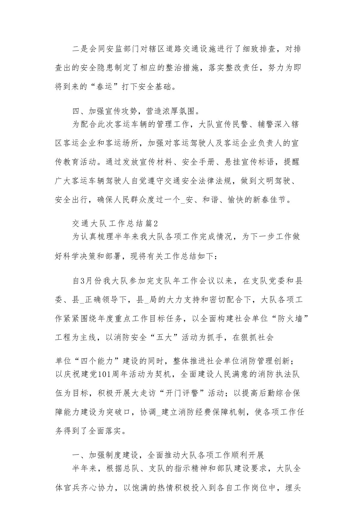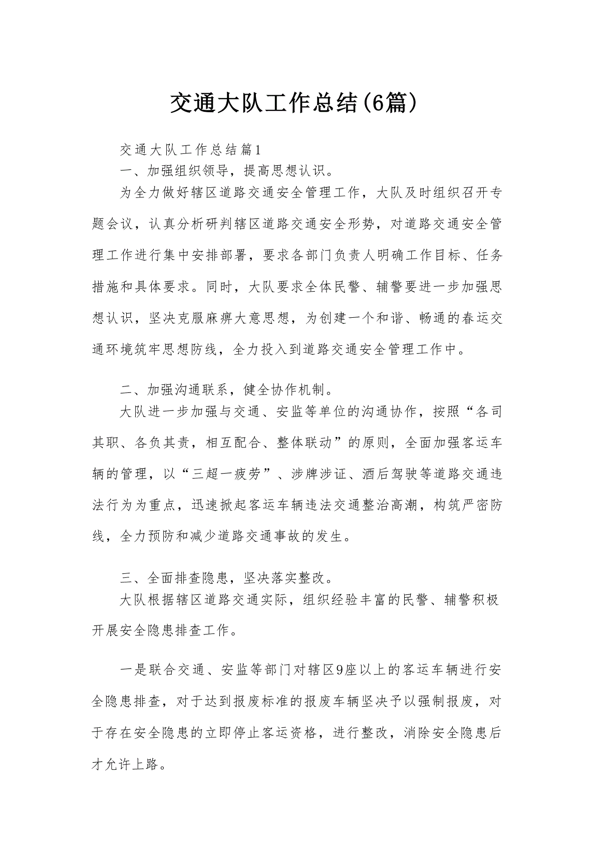 交通大队严格执法,维护交通秩序,提升道路安全,减少交通事故,保障市民出行顺畅。下面是网友整理编辑的交通大队工作总结(6篇)相关范文,供大家参考学习,喜欢就下载支持!