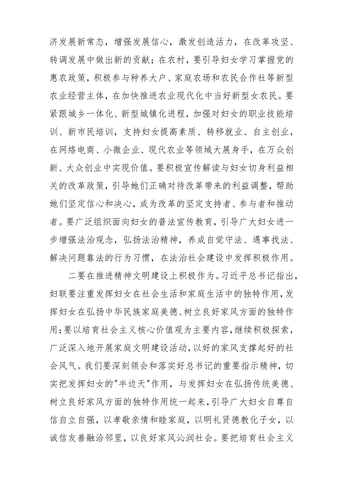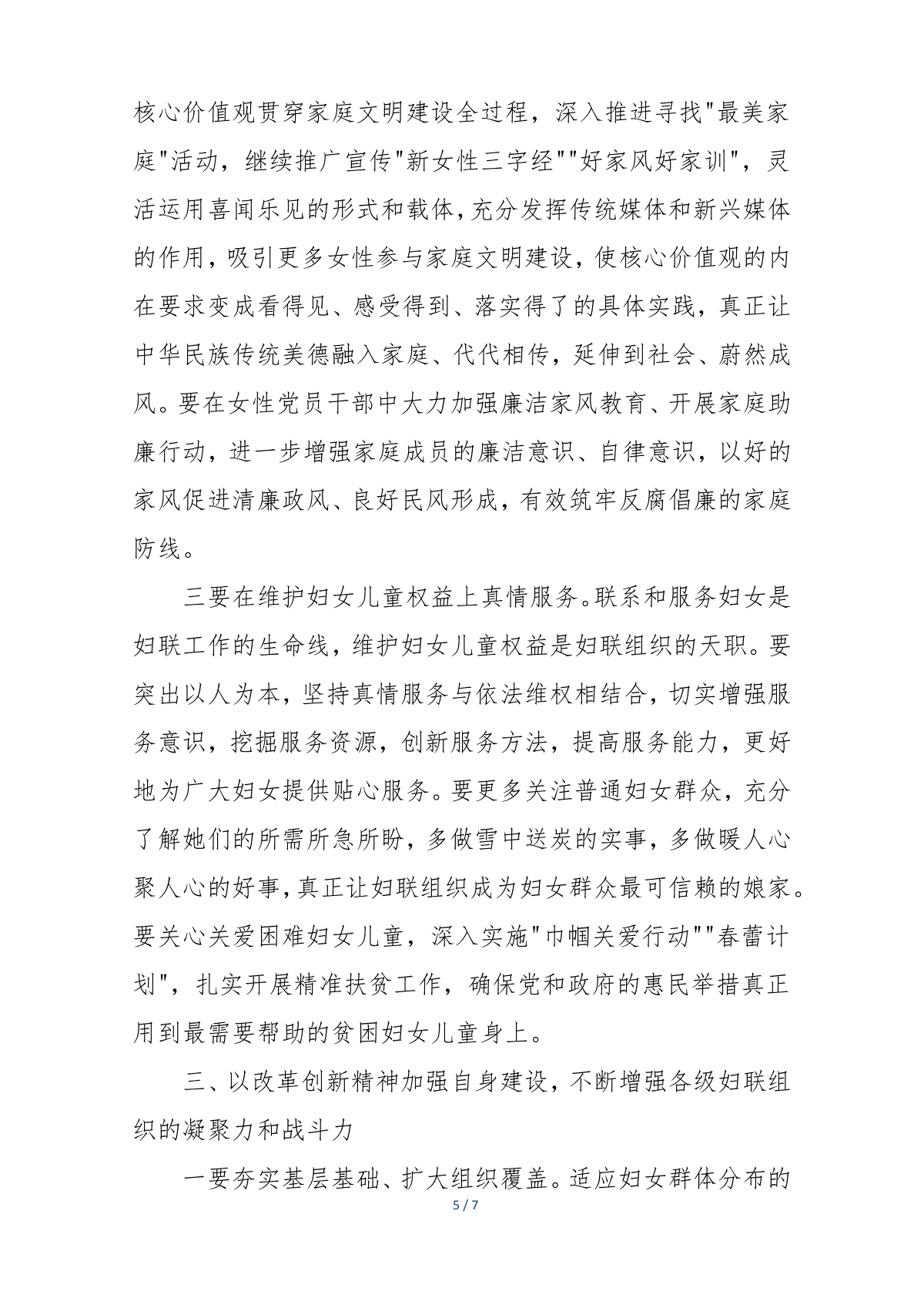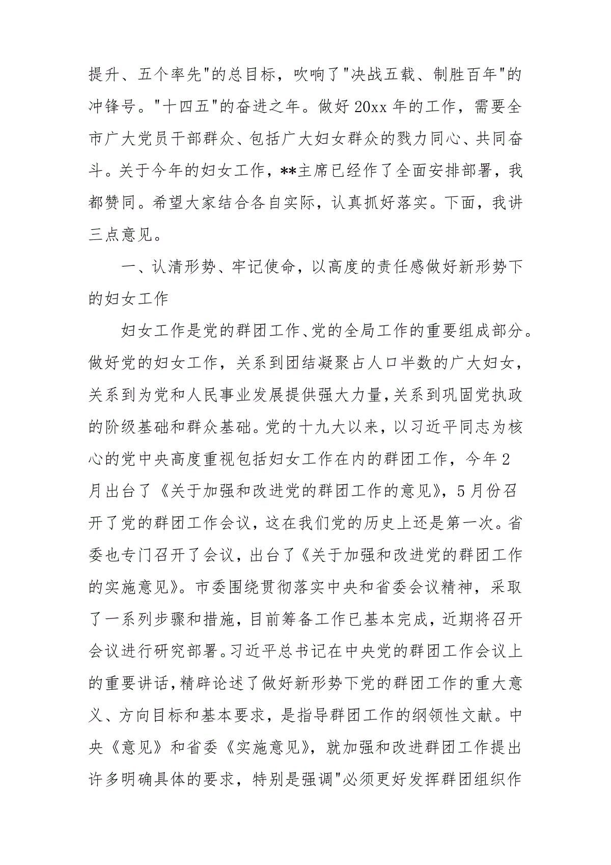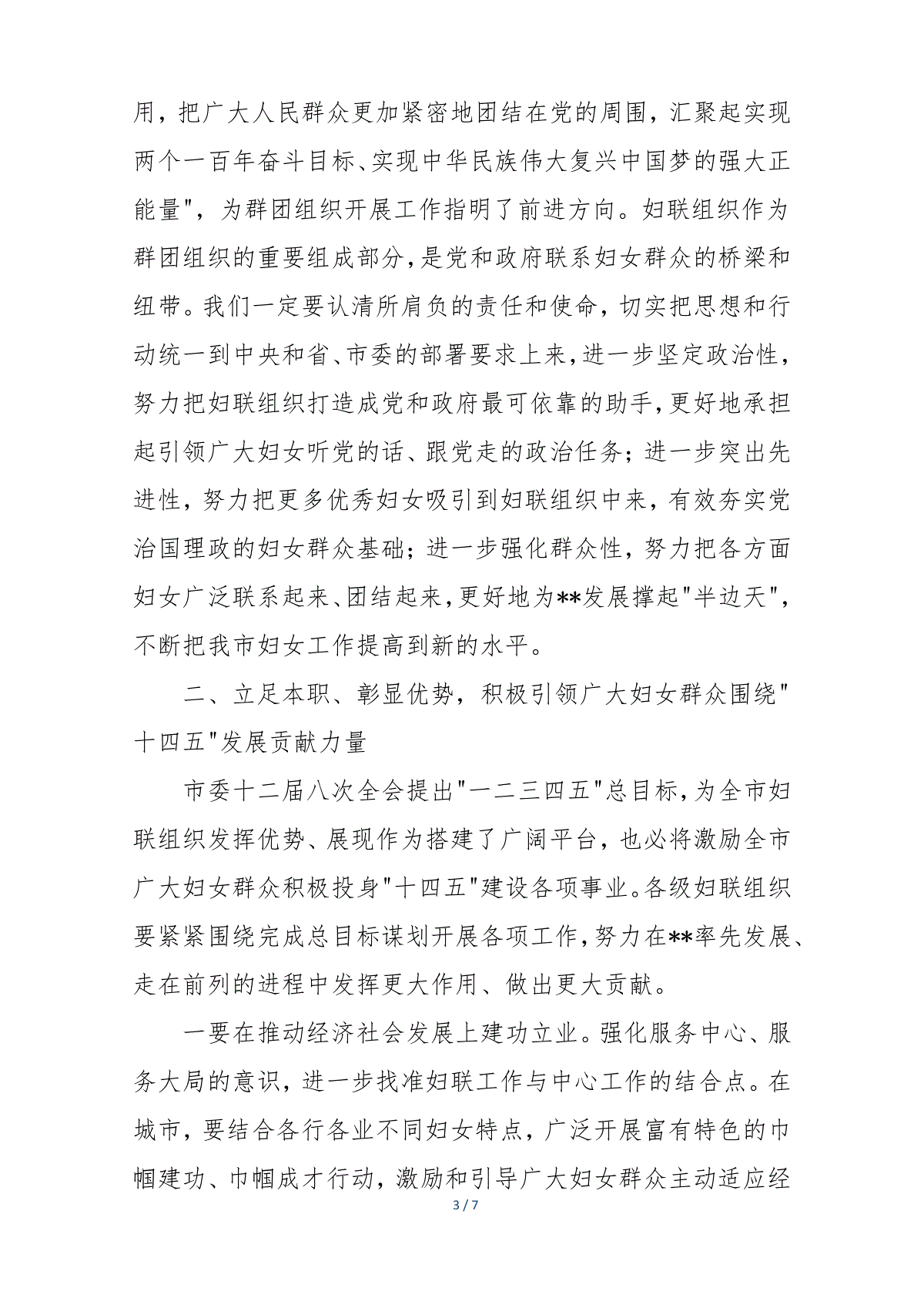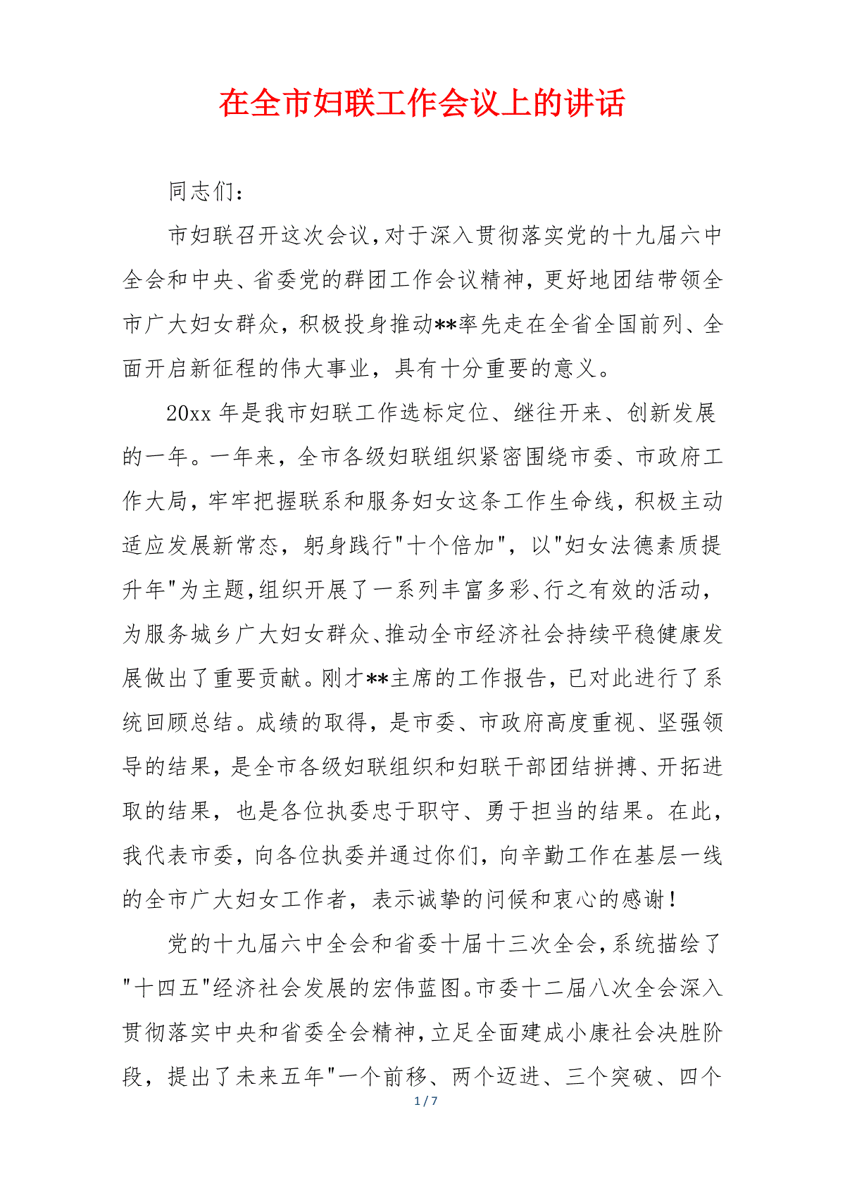 1/7在全市妇联工作会议上的讲话同志们:市妇联召开这次会议,对于深入贯彻落实党的十九届六中全会和中央、省委党的群团工作会议精神,更好地团结带领全市广大妇女群众,积极投身推动**率先走在全省全国前列、全面开启新征程的伟大事业,具有十分重要的意义。20xx年是我市妇联工作选标定位、继往开来、创新发展的一年。一年来,全市各级妇联组织紧密围绕市委、市政府工作大局,牢牢把握联系和服务妇女这条工作生命线,积极主动适应发展新常态,躬身践行十个倍加,以妇女法德素质提升年为主题,组织开展了一系列丰富多彩、行之有效的活动,为服务城乡广大妇女群众、推动全市经济社会持续平稳健康发展做出了重要贡献。刚才**主席的工作报告,已对此进行了系统回顾总结。成绩的取得,是市委、市政府高度重视、坚强领导的结果,是全市各级妇联组织和妇联干部团结拼搏、开拓进取的结果,也是各位执委忠于职守、勇于担当的结果。在此,我代表市委,向各位执委并通过你们,向辛勤工作在基层一线的全市广大妇女工作者,表示诚挚的问候和衷心的感谢!党的十九届六中全会和省委十届十三次全会,系统描绘了十四五经济社会发展的宏伟蓝图。市委十二届八次全会深入贯彻落实中央和省委全会精神,立足全面建成小康社会决胜阶段,提出了未来五年一个前移、两个迈进、三个突破、四个提升、五个率先的总目标,吹响了决战五载、制胜百年的冲锋号。十四五的奋进之年。做好20xx年的工作,需要全市广大党员干部群众、包括广大妇女群众的戮力同心、共同奋斗。关于今年的妇女工作,**主席已经作了全面安排部署,我都赞同。希望大家结合各自实际,认真抓好落实。下面,我讲三点意见。一、认清形势、牢记使命,以高度的责任感做好新形势下的妇女工作妇女工作是党的群团工作、党的全局工作的重要组成部分。做好党的妇女工作,关系到团结凝聚占人口半数的广大妇女,关系到为党和人民事业发展提供强大力量,关系到巩固党执政的阶级基础和群众基础。党的十九大以来,以习近平同志为核心的党中央高度重视包括妇女工作在内的群团工作,今年2月出台了《关于加强和改进党的群团工作的意见》,5月份召开了党的群团工作会议,这在我们党的历史上还是第一次。省委也专门召开了会议,出台了《关于加强和改进党的群团工作的实施意见》。市委围绕贯彻落实中央和省委会议精神,采取了一系列步骤和措施,目前筹备工作已基本完成,近期将召开会议进行研究部署。习近平总书记在中央党的群团工作会议上的重要讲话,精辟论述了做好新形势下党的群团工作的重大意义、方向目标和基本要求,是指导群团工作的纲领性文献。中央《意见》和省委《实施意见》,就加强和改进群团工作提出许多明确具体的要求,特别是强调必须更好发挥群团组织作3/7用,把广大人民群众更加紧密地团结在党的周围,汇聚起实现两个一百年奋斗目标、实现中华民族伟大复兴中国梦的强大正能量,为群团组织开展工作指明了前进方向。妇联组织作为群团组织的重要组成部分,是党和政府联系妇女群众的桥梁和纽带。我们一定要认清所肩负的责任和使命,切实把思想和行动统一到中央和省、市委的部署要求上来,进一步坚定政治性,努力把妇联组织打造成党和政府最可依靠的助手,更好地承担起引领广大妇女听党的话、跟党走的政治任务;进一步突出先进性,努力把更多优秀妇女吸引到妇联组织中来,有效夯实党治国理政的妇女群众基础;进一步强化群众性,努力把各方面妇女广泛联系起来、团结起来,更好地为**发展撑起半边天,不断把我市妇女工作提高到新的水平。二、立足本职、彰显优势,积极引领广大妇女群众围绕十四五发展贡献力量市委十二届八次全会提出一二三四五总目标,为全市妇联组织发挥优势、展现作为搭建了广阔平台,也必将激励全市广大妇女群众积极投身十四五建设各项事业。各级妇联组织要紧紧围绕完成总目标谋划开展各项工作,努力在**率先发展、走在前列的进程中发挥更大作用、做出更大贡献。一要在推动经济社会发展上建功立业。强化服务中心、服务大局的意识,进一步找准妇联工作与中心工作的结合点。在城市,要结合各行各业不同妇女特点,广泛开展富有特色的巾帼建功、巾帼成才行动,激励和引导广大妇女群众主动适应经济发展新常态,增强发展信心,激发创造活力,在改革攻坚、转调发展中做出新的贡献;在农村,要引导妇女学习掌握党的惠农政策,积极参与种养大户、家庭农场和农民合作社等新型农业经营主体,在加快推进农业现代化中当好新型女农民。要紧跟城乡一体化、新型城镇化进程,加强对妇女的职业技能培训、新市民培训,支持妇女提高素质、转移就业、自主创业,在网络电商、小微企业、现代农业等领域大展身手,在万众创新、大众创业中实现价值。要积极宣传解读与妇女切身利益相关的改革政策,引导她们正确对待改革带来的利益调整,帮助她们坚定信心和决心,成为改革的坚定支持者、参与者和推动者。要广泛组织面向妇女的普法宣传教育,引导广大妇女进一步增强法治观念,弘扬法治精神,养成自觉守法、遇事找法、解决问题靠法的行为习惯,在法治社会建设中发挥积极作用。二要在推进精神文明建设上积极作为。习近平总书