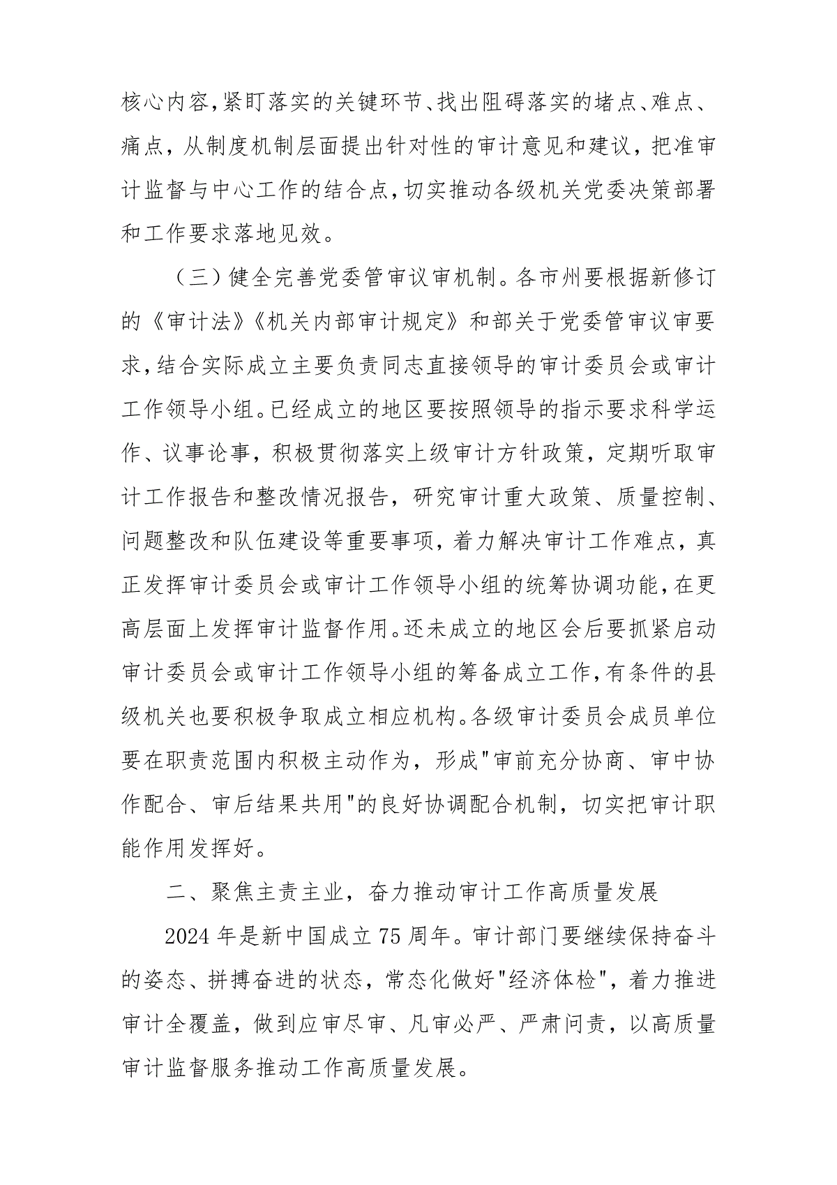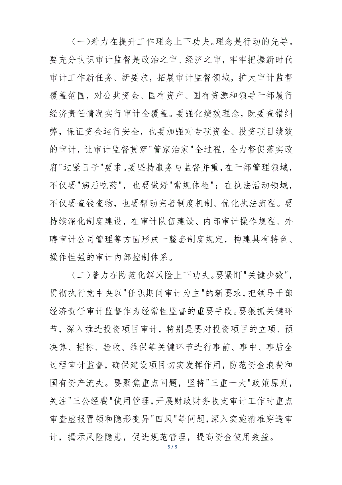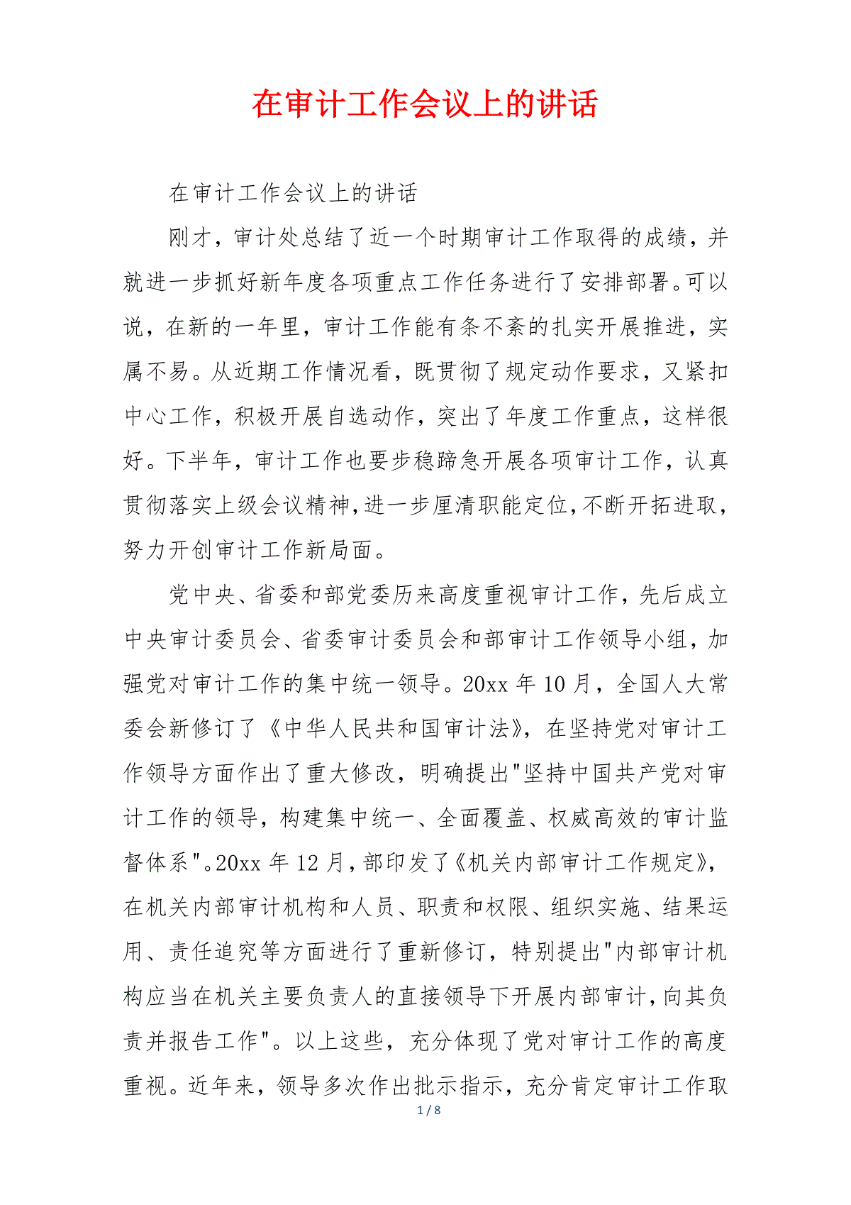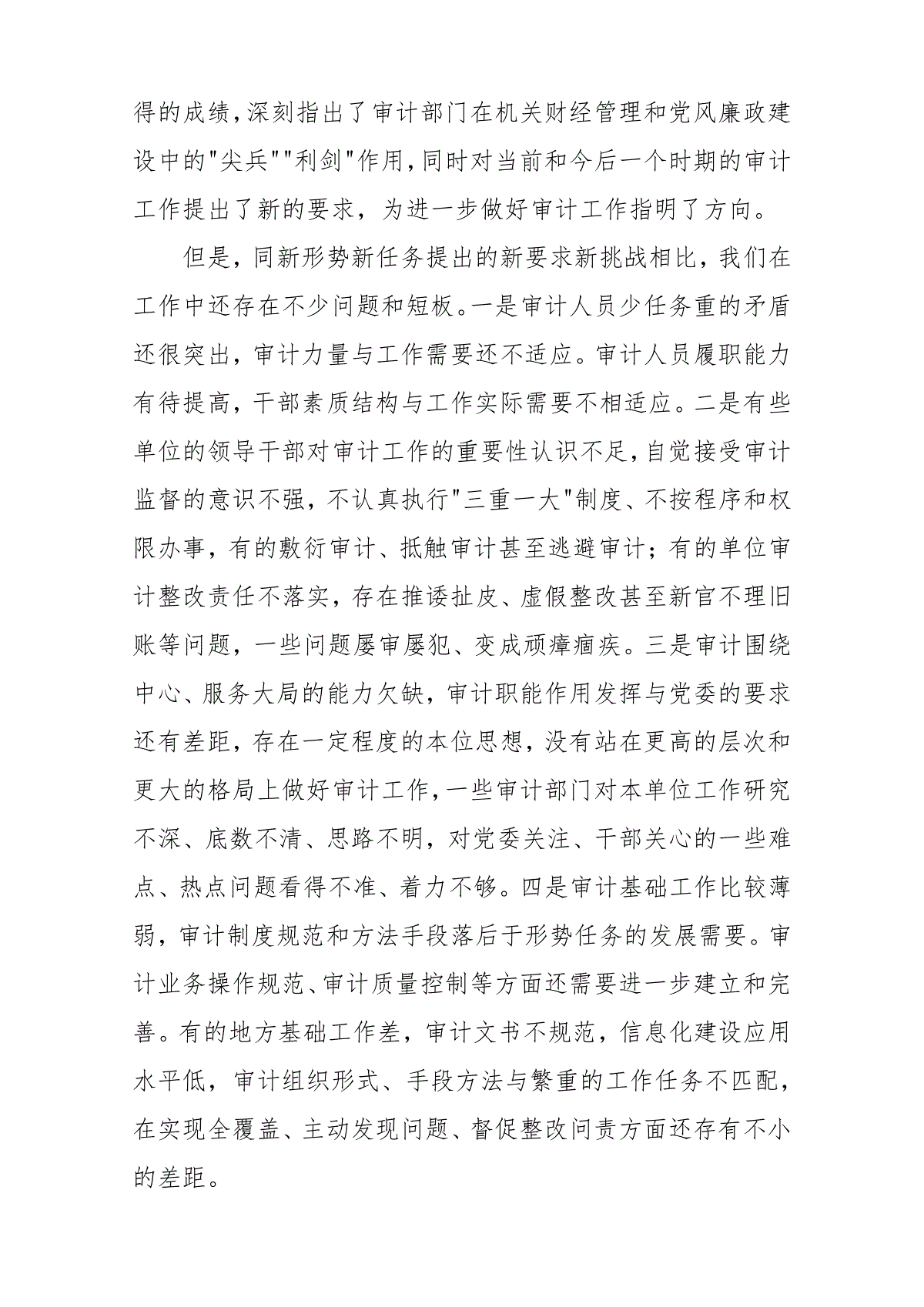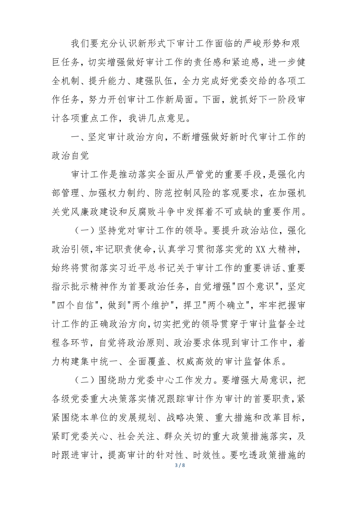 1/8在审计工作会议上的讲话在审计工作会议上的讲话刚才,审计处总结了近一个时期审计工作取得的成绩,并就进一步抓好新年度各项重点工作任务进行了安排部署。可以说,在新的一年里,审计工作能有条不紊的扎实开展推进,实属不易。从近期工作情况看,既贯彻了规定动作要求,又紧扣中心工作,积极开展自选动作,突出了年度工作重点,这样很好。下半年,审计工作也要步稳蹄急开展各项审计工作,认真贯彻落实上级会议精神,进一步厘清职能定位,不断开拓进取,努力开创审计工作新局面。党中央、省委和部党委历来高度重视审计工作,先后成立中央审计委员会、省委审计委员会和部审计工作领导小组,加强党对审计工作的集中统一领导。20xx年10月,全国人大常委会新修订了《中华人民共和国审计法》,在坚持党对审计工作领导方面作出了重大修改,明确提出坚持中国共产党对审计工作的领导,构建集中统一、全面覆盖、权威高效的审计监督体系。20xx年12月,部印发了《机关内部审计工作规定》,在机关内部审计机构和人员、职责和权限、组织实施、结果运用、责任追究等方面进行了重新修订,特别提出内部审计机构应当在机关主要负责人的直接领导下开展内部审计,向其负责并报告工作。以上这些,充分体现了党对审计工作的高度重视。近年来,领导多次作出批示指示,充分肯定审计工作取得的成绩,深刻指出了审计部门在机关财经管理和党风廉政建设中的尖兵利剑作用,同时对当前和今后一个时期的审计工作提出了新的要求,为进一步做好审计工作指明了方向。但是,同新形势新任务提出的新要求新挑战相比,我们在工作中还存在不少问题和短板。一是审计人员少任务重的矛盾还很突出,审计力量与工作需要还不适应。审计人员履职能力有待提高,干部素质结构与工作实际需要不相适应。二是有些单位的领导干部对审计工作的重要性认识不足,自觉接受审计监督的意识不强,不认真执行三重一大制度、不按程序和权限办事,有的敷衍审计、抵触审计甚至逃避审计;有的单位审计整改责任不落实,存在推诿扯皮、虚假整改甚至新官不理旧账等问题,一些问题屡审屡犯、变成顽瘴痼疾。三是审计围绕中心、服务大局的能力欠缺,审计职能作用发挥与党委的要求还有差距,存在一定程度的本位思想,没有站在更高的层次和更大的格局上做好审计工作,一些审计部门对本单位工作研究不深、底数不清、思路不明,对党委关注、干部关心的一些难点、热点问题看得不准、着力不够。四是审计基础工作比较薄弱,审计制度规范和方法手段落后于形势任务的发展需要。审计业务操作规范、审计质量控制等方面还需要进一步建立和完善。有的地方基础工作差,审计文书不规范,信息化建设应用水平低,审计组织形式、手段方法与繁重的工作任务不匹配,在实现全覆盖、主动发现问题、督促整改问责方面还存有不小的差距。3/8我们要充分认识新形式下审计工作面临的严峻形势和艰巨任务,切实增强做好审计工作的责任感和紧迫感,进一步健全机制、提升能力、建强队伍,全力完成好党委交给的各项工作任务,努力开创审计工作新局面。下面,就抓好下一阶段审计各项重点工作,我讲几点意见。一、坚定审计政治方向,不断增强做好新时代审计工作的政治自觉审计工作是推动落实全面从严管党的重要手段,是强化内部管理、加强权力制约、防范控制风险的客观要求,在加强机关党风廉政建设和反腐败斗争中发挥着不可或缺的重要作用。(一)坚持党对审计工作的领导。要提升政治站位,强化政治引领,牢记职责使命,认真学习贯彻落实党的XX大精神,始终将贯彻落实习近平总书记关于审计工作的重要讲话、重要指示批示精神作为首要政治任务,自觉增强四个意识,坚定四个自信,做到两个维护,捍卫两个确立,牢牢把握审计工作的正确政治方向,切实把党的领导贯穿于审计监督全过程各环节,自觉将政治原则、政治要求体现到审计工作中,着力构建集中统一、全面覆盖、权威高效的审计监督体系。(二)围绕助力党委中心工作发力。要增强大局意识,把各级党委重大决策落实情况跟踪审计作为审计的首要职责,紧紧围绕本单位的发展规划、战略决策、重大措施和改革目标,紧盯党委关心、社会关注、群众关切的重大政策措施落实,及时跟进审计,提高审计的针对性、时效性。要吃透政策措施的核心内容,紧盯落实的关键环节、找出阻碍落实的堵点、难点、痛点,从制度机制层面提出针对性的审计意见和建议,把准审计监督与中心工作的结合点,切实推动各级机关党委决策部署和工作要求落地见效。(三)健全完善党委管审议审机制。各市州要根据新修订的《审计法》《机关内部审计规定》和部关于党委管审议审要求,结合实际成立主要负责同志直接领导的审计委员会或审计工作领导小组。已经成立的地区要按照领导的指示要求科学运作、议事论事,积极贯彻落实上级审计方针政策,定期听取审计工作报告和整改情况报告,研究审计重大政策、质量控制、问题整改和队伍建设等重要事项,着力解决审计工作难点,真正发挥审计委员会或审计工作领导小组的统筹协调功能,在更高层面上发挥审计监督作用。还未成立的地区会后要抓紧启动审计委员会或审计工作领导小组的筹备成立工作,有条件的县级机