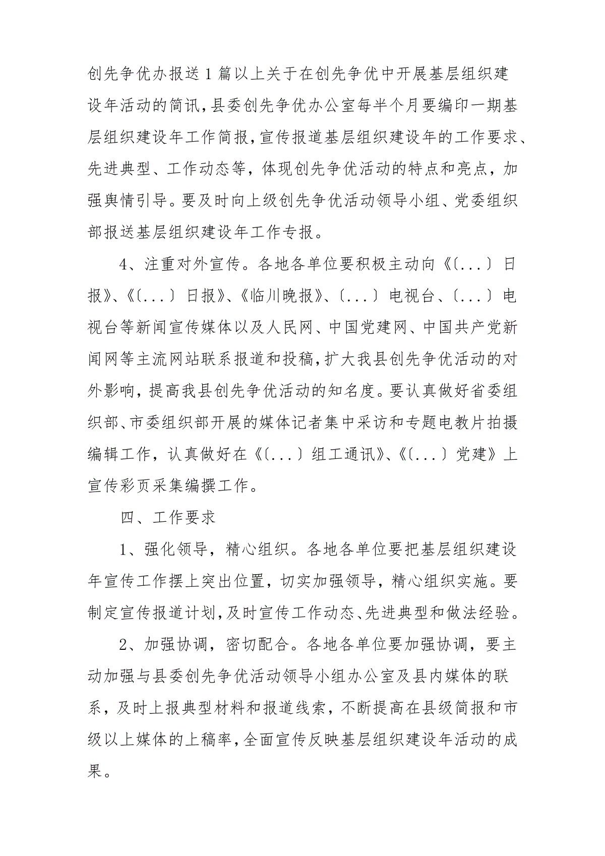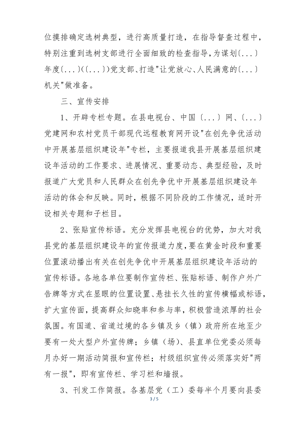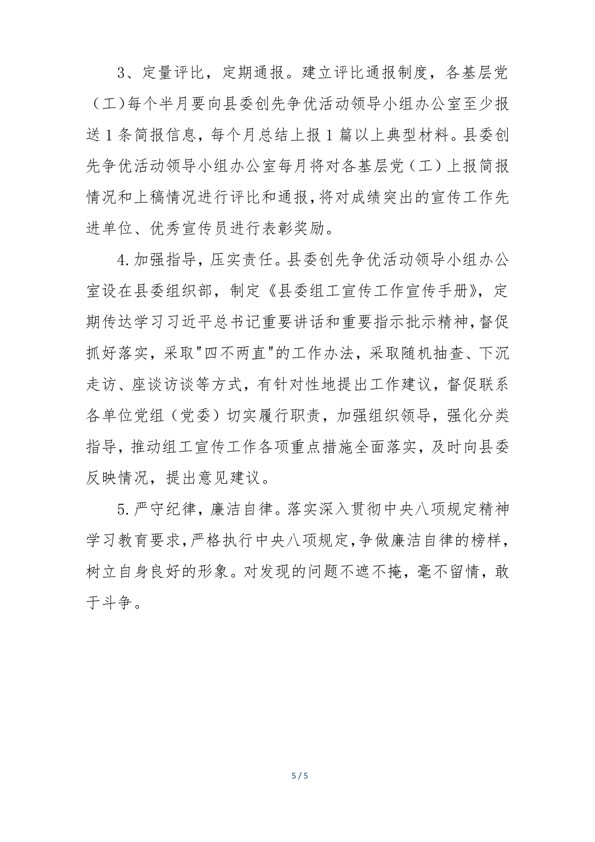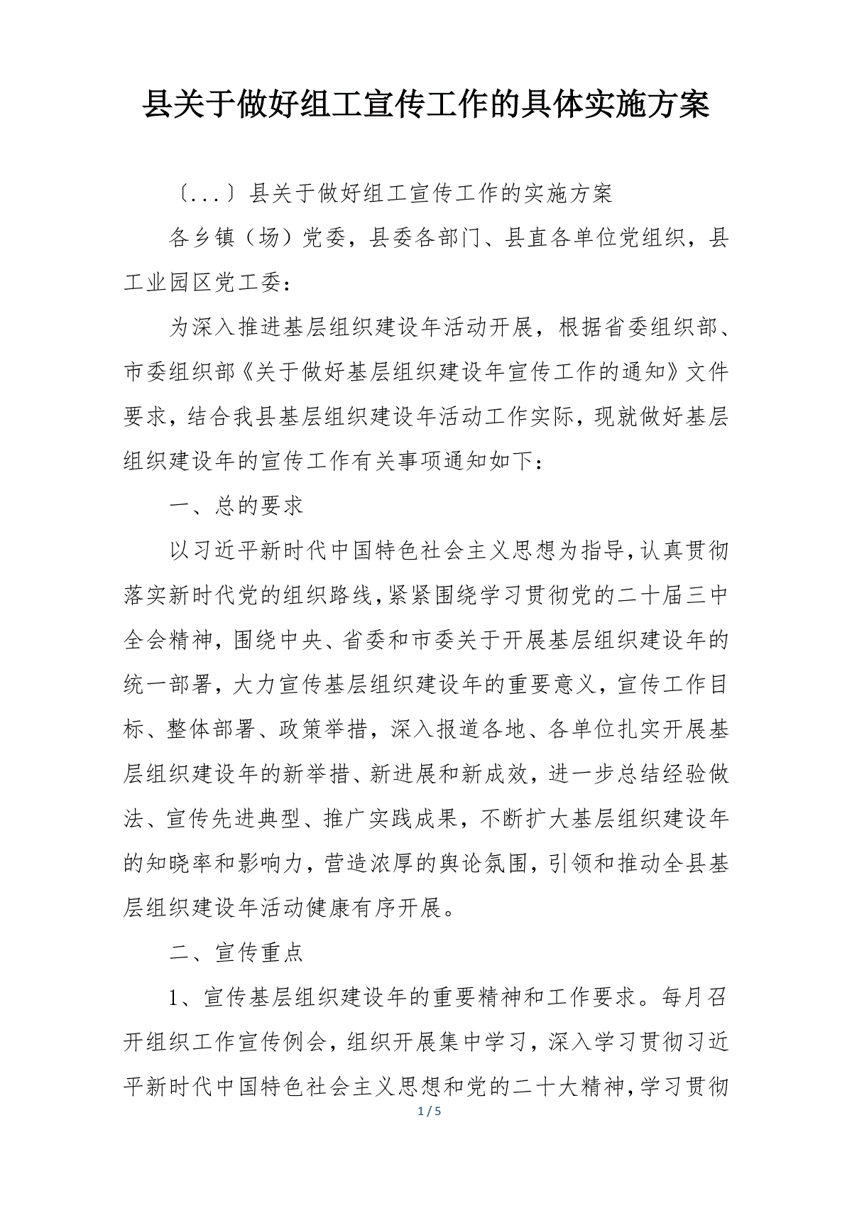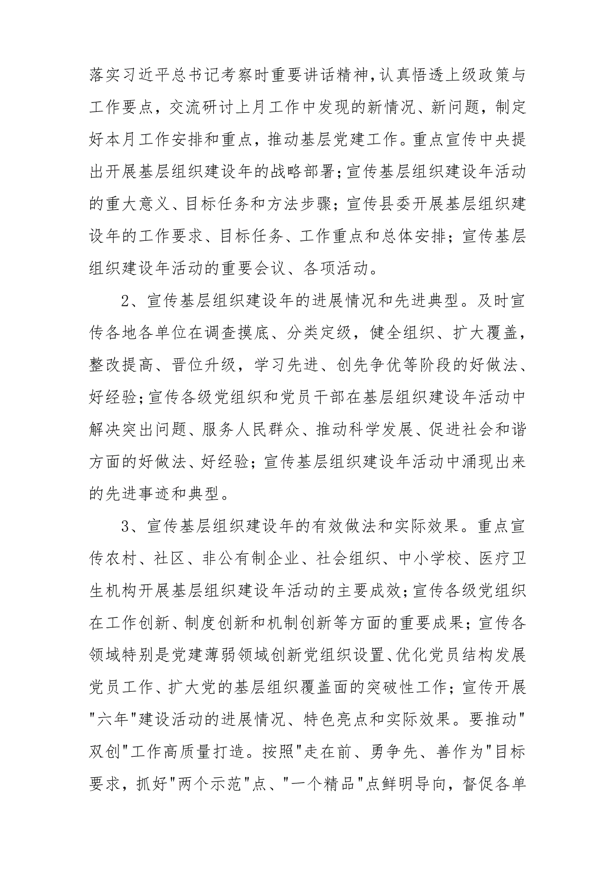 1/5县关于做好组工宣传工作的具体实施方案〔...〕县关于做好组工宣传工作的实施方案各乡镇(场)党委,县委各部门、县直各单位党组织,县工业园区党工委:为深入推进基层组织建设年活动开展,根据省委组织部、市委组织部《关于做好基层组织建设年宣传工作的通知》文件要求,结合我县基层组织建设年活动工作实际,现就做好基层组织建设年的宣传工作有关事项通知如下:一、总的要求以习近平新时代中国特色社会主义思想为指导,认真贯彻落实新时代党的组织路线,紧紧围绕学习贯彻党的二十届三中全会精神,围绕中央、省委和市委关于开展基层组织建设年的统一部署,大力宣传基层组织建设年的重要意义,宣传工作目标、整体部署、政策举措,深入报道各地、各单位扎实开展基层组织建设年的新举措、新进展和新成效,进一步总结经验做法、宣传先进典型、推广实践成果,不断扩大基层组织建设年的知晓率和影响力,营造浓厚的舆论氛围,引领和推动全县基层组织建设年活动健康有序开展。二、宣传重点1、宣传基层组织建设年的重要精神和工作要求。每月召开组织工作宣传例会,组织开展集中学习,深入学习贯彻习近平新时代中国特色社会主义思想和党的二十大精神,学习贯彻落实习近平总书记考察时重要讲话精神,认真悟透上级政策与工作要点,交流研讨上月工作中发现的新情况、新问题,制定好本月工作安排和重点,推动基层党建工作。重点宣传中央提出开展基层组织建设年的战略部署;宣传基层组织建设年活动的重大意义、目标任务和方法步骤;宣传县委开展基层组织建设年的工作要求、目标任务、工作重点和总体安排;宣传基层组织建设年活动的重要会议、各项活动。2、宣传基层组织建设年的进展情况和先进典型。及时宣传各地各单位在调查摸底、分类定级,健全组织、扩大覆盖,整改提高、晋位升级,学习先进、创先争优等阶段的好做法、好经验;宣传各级党组织和党员干部在基层组织建设年活动中解决突出问题、服务人民群众、推动科学发展、促进社会和谐方面的好做法、好经验;宣传基层组织建设年活动中涌现出来的先进事迹和典型。3、宣传基层组织建设年的有效做法和实际效果。重点宣传农村、社区、非公有制企业、社会组织、中小学校、医疗卫生机构开展基层组织建设年活动的主要成效;宣传各级党组织在工作创新、制度创新和机制创新等方面的重要成果;宣传各领域特别是党建薄弱领域创新党组织设置、优化党员结构发展党员工作、扩大党的基层组织覆盖面的突破性工作;宣传开展六年建设活动的进展情况、特色亮点和实际效果。要推动双创工作高质量打造。按照走在前、勇争先、善作为目标要求,抓好两个示范点、一个精品点鲜明导向,督促各单3/5位摸排确定选树典型,进行高质量打造,在指导督查过程中,特别注重到选树支部进行全面细致的检查指导,为谋划〔...〕年度〔...〕(〔...〕)党支部、打造让党放心、人民满意的〔...〕机关做准备。三、宣传安排1、开辟专栏专题。在县电视台、中国〔...〕网、〔...〕党建网和农村党员干部现代远程教育网开设在创先争优活动中开展基层组织建设年专栏,主要报道我县开展基层组织建设年活动的工作要求、进展情况、重要动态、典型经验,及时报道广大党员和人民群众在创先争优中开展基层组织建设年活动的体会和反映。同时,根据不同阶段的工作情况,适时开设相关专题和子栏目。2、张贴宣传标语。充分发挥县电视台的优势,加大对我县党的基层组织建设年的宣传报道力度,要在黄金时段和重要位置滚动播出有关在创先争优中开展基层组织建设年活动的宣传标语。各地各单位要制作宣传栏、张贴标语、制作户外广告牌等方式在显眼的位置设置、悬挂长久性的宣传横幅或标语,扩大宣传面,提高群众知晓率和参与率,积极营造浓厚的社会氛围。有国道、省道过境的各乡镇及乡(镇)政府所在地至少要有一处大型户外宣传牌;乡镇(场)、县直单位党委必须每月办好一期活动简报和宣传栏;村级组织宣传必须落实好两有一报,即有宣传栏、学习栏和墙报。3、刊发工作简报。各基层党(工)委每半个月要向县委创先争优办报送1篇以上关于在创先争优中开展基层组织建设年活动的简讯,县委创先争优办公室每半个月要编印一期基层组织建设年工作简报,宣传报道基层组织建设年的工作要求、先进典型、工作动态等,体现创先争优活动的特点和亮点,加强舆情引导。要及时向上级创先争优活动领导小组、党委组织部报送基层组织建设年工作专报。4、注重对外宣传。各地各单位要积极主动向《〔...〕日报》、《〔...〕日报》、《临川晚报》、〔...〕电视台、〔...〕电视台等新闻宣传媒体以及人民网、中国党建网、中国共产党新闻网等主流网站联系报道和投稿,扩大我县创先争优活动的对外影响,提高我县创先争优活动的知名度。要认真做好省委组织部、市委组织部开展的媒体记者集中采访和专题电教片拍摄编辑工作,认真做好在《〔...〕组工通讯》、《〔...〕党建》上宣传彩页采集编撰工作。四、工作要求1、强化领导,精心组织。各地各单位要把基层组织建设年宣传工作摆上突出位置,切实加强领导,精心组织实施。要制定宣传报道计划,及时宣传工作动态、先进典型和做法经验。2