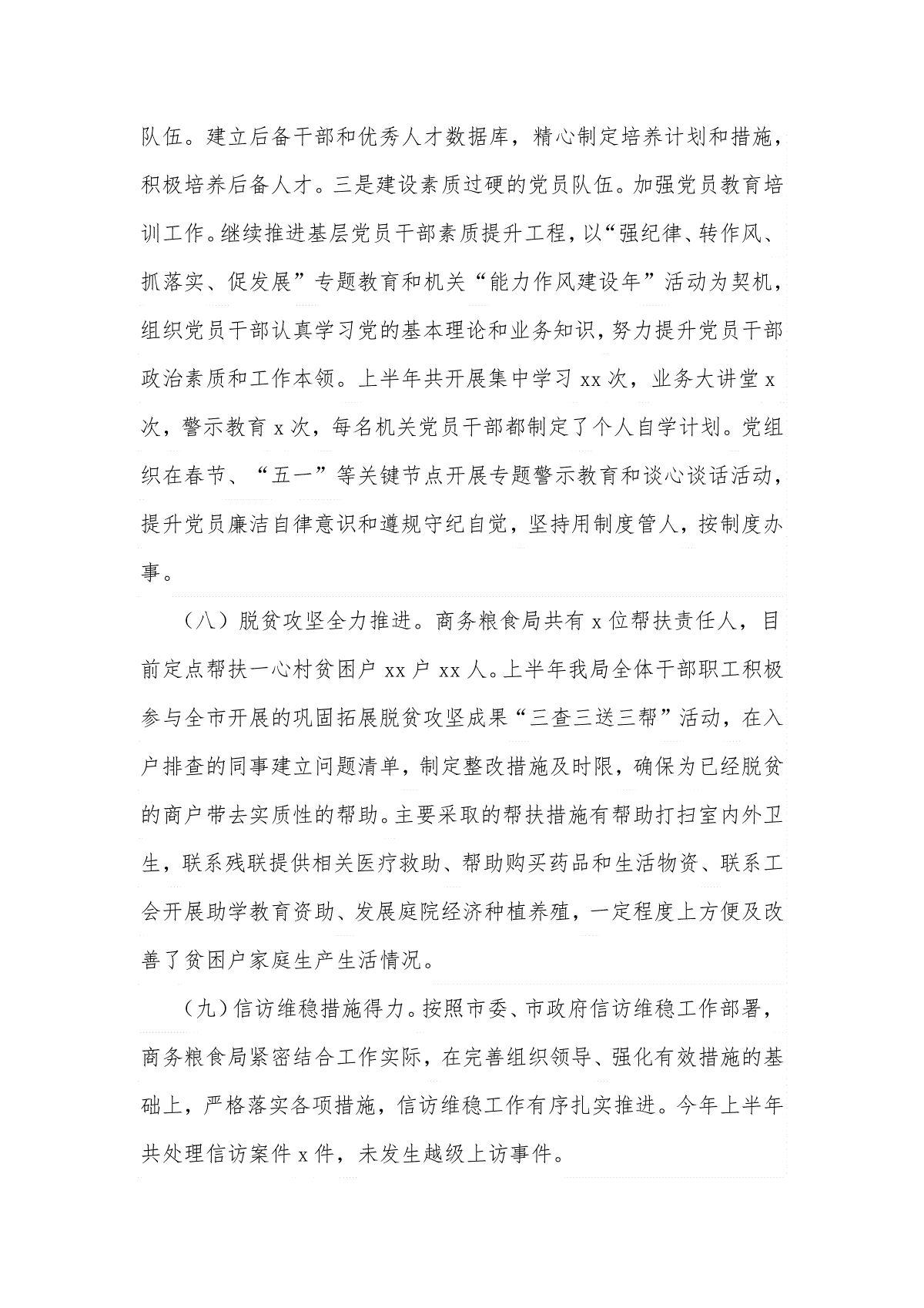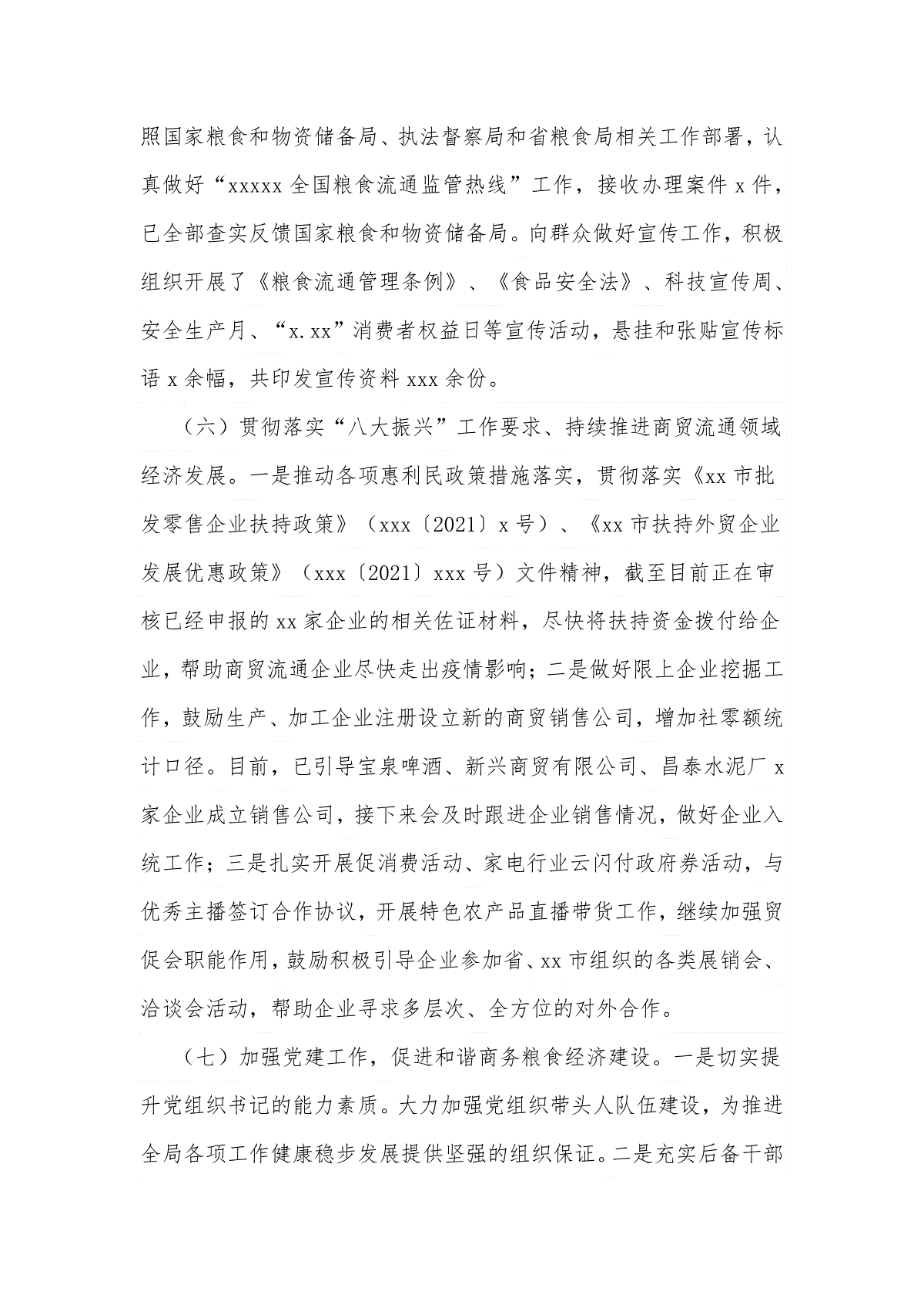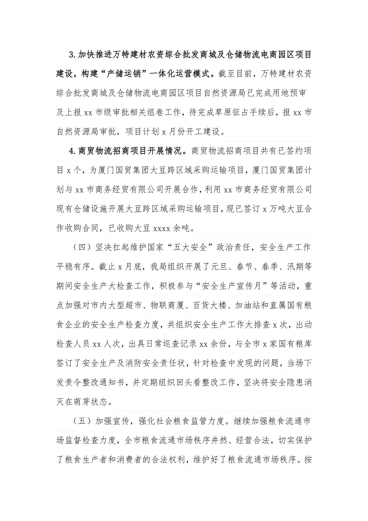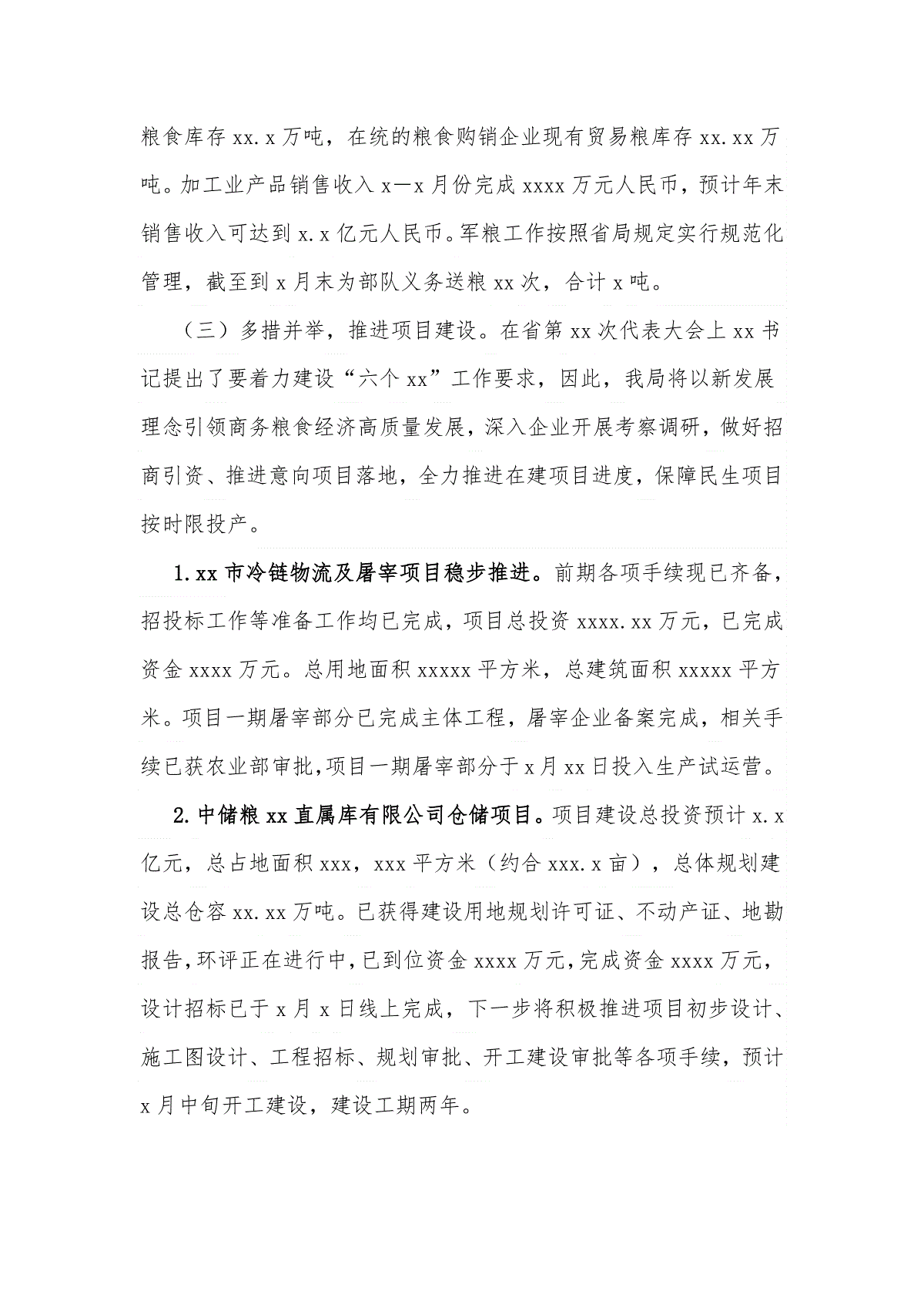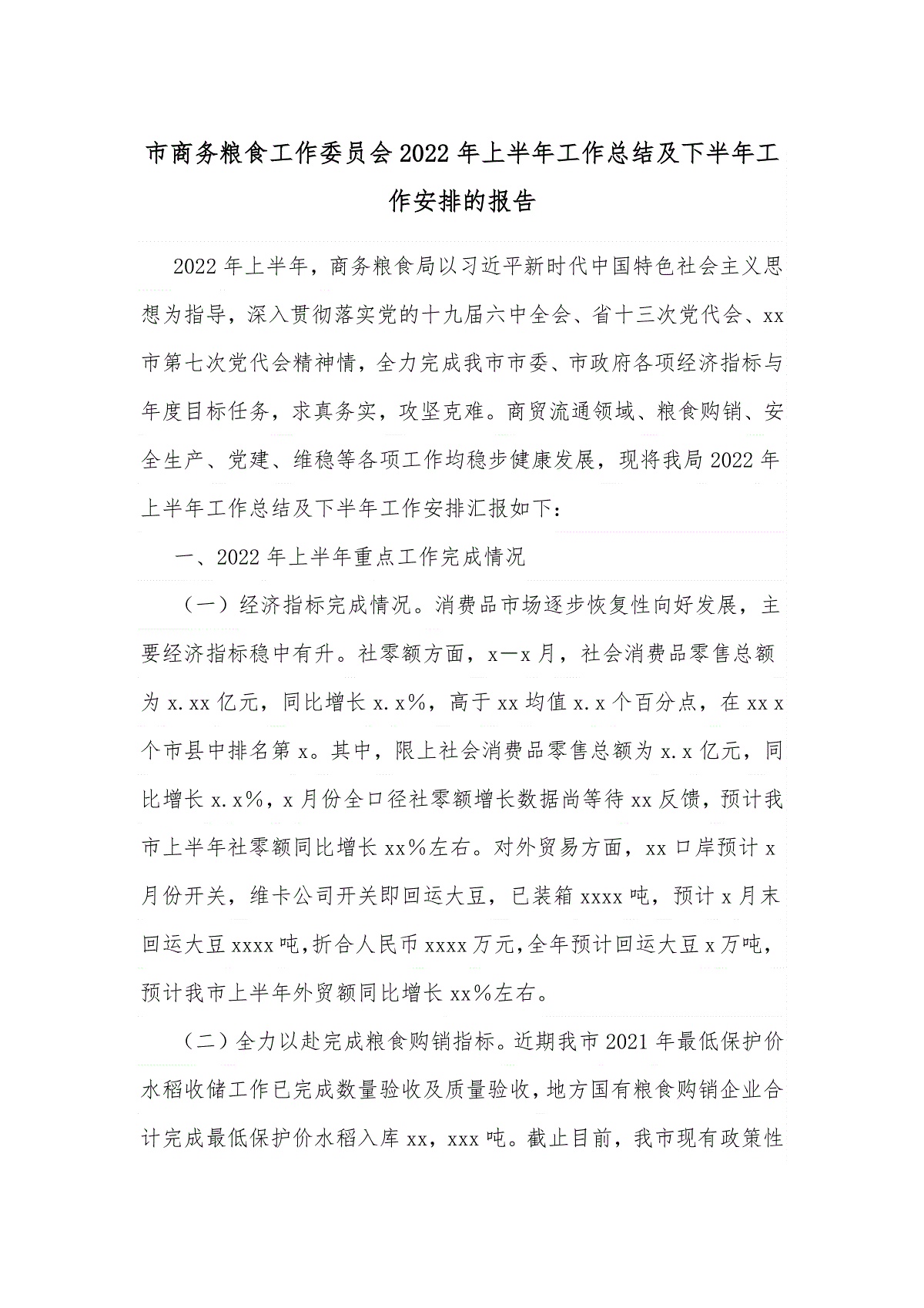 市商务粮食工作委员会2022年上半年工作总结及下半年工作安排的报告2022年上半年,商务粮食局以习近平新时代中国特色社会主义思想为指导,深入贯彻落实党的十九届六中全会、省十三次党代会、xx市第七次党代会精神情,全力完成我市市委、市政府各项经济指标与年度目标任务,求真务实,攻坚克难。商贸流通领域、粮食购销、安全生产、党建、维稳等各项工作均稳步健康发展,现将我局2022年上半年工作总结及下半年工作安排汇报如下:一、2022年上半年重点工作完成情况(一)经济指标完成情况。消费品市场逐步恢复性向好发展,主要经济指标稳中有升。社零额方面,x-x月,社会消费品零售总额为x.xx亿元,同比增长x.x%,高于xx均值x.x个百分点,在xxx个市县中排名第x。其中,限上社会消费品零售总额为x.x亿元,同比增长x.x%,x月份全口径社零额增长数据尚等待xx反馈,预计我市上半年社零额同比增长xx%左右。对外贸易方面,xx口岸预计x月份开关,维卡公司开关即回运大豆,已装箱xxxx吨,预计x月末回运大豆xxxx吨,折合人民币xxxx万元,全年预计回运大豆x万吨,预计我市上半年外贸额同比增长xx%左右。(二)全力以赴完成粮食购销指标。近期我市2021年最低保护价水稻收储工作已完成数量验收及质量验收,地方国有粮食购销企业合计完成最低保护价水稻入库xx,xxx吨。截止目前,我市现有政策性粮食库存xx.x万吨,在统的粮食购销企业现有贸易粮库存xx.xx万吨。加工业产品销售收入x-x月份完成xxxx万元人民币,预计年末销售收入可达到x.x亿元人民币。军粮工作按照省局规定实行规范化管理,截至到x月末为部队义务送粮xx次,合计x吨。(三)多措并举,推进项目建设。在省第xx次代表大会上xx书记提出了要着力建设“六个xx”工作要求,因此,我局将以新发展理念引领商务粮食经济高质量发展,深入企业开展考察调研,做好招商引资、推进意向项目落地,全力推进在建项目进度,保障民生项目按时限投产。1.xx市冷链物流及屠宰项目稳步推进。前期各项手续现已齐备,招投标工作等准备工作均已完成,项目总投资xxxx.xx万元,已完成资金xxxx万元。总用地面积xxxxx平方米,总建筑面积xxxxx平方米。项目一期屠宰部分已完成主体工程,屠宰企业备案完成,相关手续已获农业部审批,项目一期屠宰部分于x月xx日投入生产试运营。2.中储粮xx直属库有限公司仓储项目。项目建设总投资预计x.x亿元,总占地面积xxx,xxx平方米(约合xxx.x亩),总体规划建设总仓容xx.xx万吨。已获得建设用地规划许可证、不动产证、地勘报告,环评正在进行中,已到位资金xxxx万元,完成资金xxxx万元,设计招标已于x月x日线上完成,下一步将积极推进项目初步设计、施工图设计、工程招标、规划审批、开工建设审批等各项手续,预计x月中旬开工建设,建设工期两年。3.加快推进万特建材农资综合批发商城及仓储物流电商园区项目建设,构建“产储运销”一体化运营模式。截至目前,万特建材农资综合批发商城及仓储物流电商园区项目自然资源局已完成用地预审及上报xx市级审批相关组卷工作,待完成草原征占手续后,报xx市自然资源局审批,项目计划x月份开工建设。4.商贸物流招商项目开展情况。商贸物流招商项目共有已签约项目x个,为厦门国贸集团大豆跨区域采购运输项目,厦门国贸集团计划与xx市商务经贸有限公司开展合作,利用xx市商务经贸有限公司现有仓储设施开展大豆跨区域采购运输项目,现已签订x万吨大豆合作收购合同,已收购大豆xxxx余吨。(四)坚决扛起维护国家“五大安全”政治责任,安全生产工作平稳有序。截止x月底,我局组织开展了元旦、春节、春季、汛期等期间安全生产大检查工作,积极参与“安全生产宣传月”等活动,重点加强对市内大型超市、物联商厦、百货大楼、加油站和直属国有粮食企业的安全生产检查力度,共组织安全生产工作大排查x次,出动检查人员xx人次,出具日常巡查记录xx余份,与全市x家国有粮库签订了安全生产及消防安全责任状,针对检查中发现的问题,当场下发责令整改通知书,并定期组织回头看整改工作,坚决将安全隐患消灭在萌芽状态。(五)加强宣传,强化社会粮食监管力度。继续加强粮食流通市场监督检查力度,全市粮食流通市场秩序井然、经营合法,切实保护了粮食生产者和消费者的合法权利,维护好了粮食流通市场秩序。按照国家粮食和物资储备局、执法督察局和省粮食局相关工作部署,认真做好“xxxxx全国粮食流通监管热线”工作,接收办理案件x件,已全部查实反馈国家粮食和物资储备局。向群众做好宣传工作,积极组织开展了《粮食流通管理条例》、《食品安全法》、科技宣传周、安全生产月、“x.xx”消费者权益日等宣传活动,悬挂和张贴宣传标语x余幅,共印发宣传资料xxx余份。(六)贯彻落实“八大振兴”工作要求、持续推进商贸流通领域经济发展。一是推动各项惠利民政策措施落实,贯彻落实《xx市批发零售企业扶持政策》(xxx〔2021〕x号)、《xx市扶持外贸企业发展优惠政策》(xxx〔2021〕xxx号)文件精神,截至目前正在审核已经申报的xx家企业的相关佐证材料,尽快将扶持资金拨付给企业,帮助商贸流通企业尽快走出疫情影响;二是做好限上企业挖掘工作,鼓励生产、加工企业注册设立新的商贸销售公司,增加社零额统计口径。目前,已引导宝泉啤酒、新兴商贸有限公司、昌泰水泥厂x家企业成
