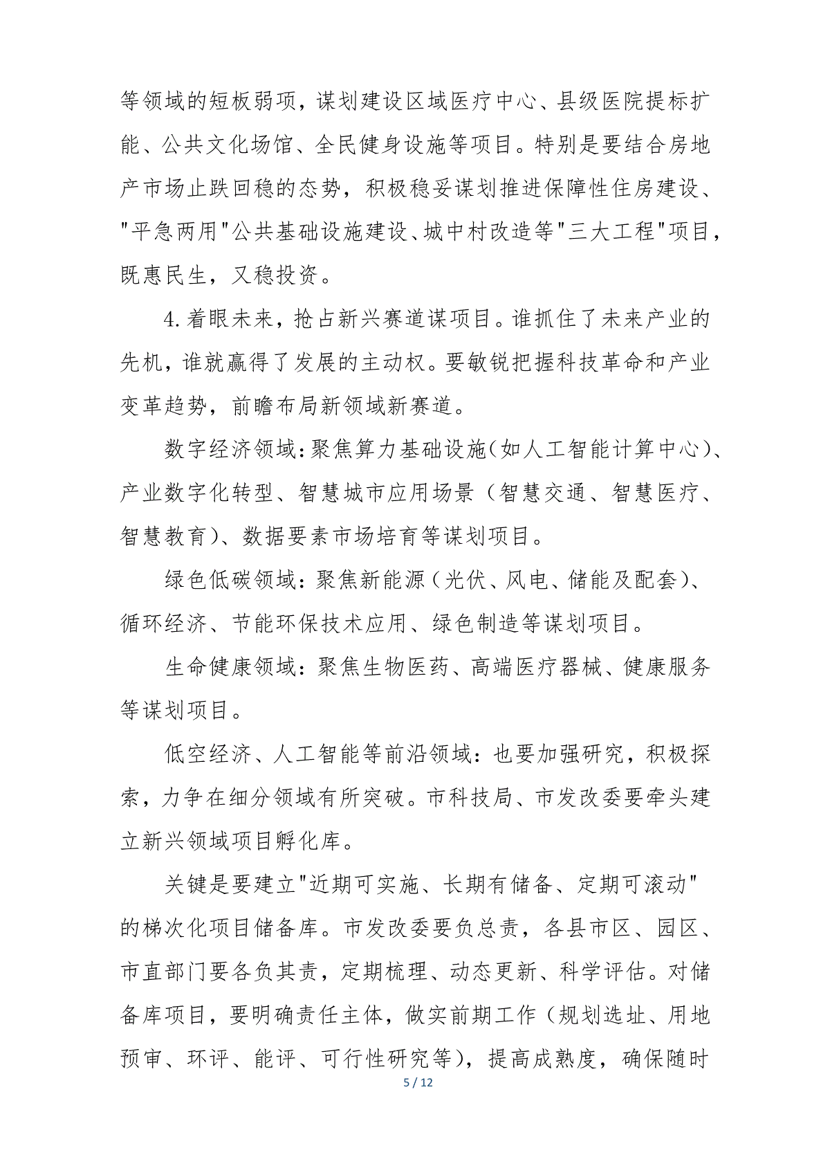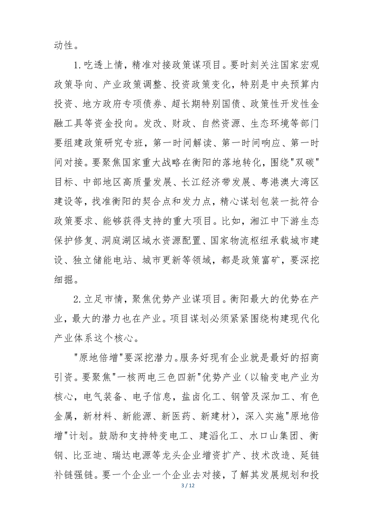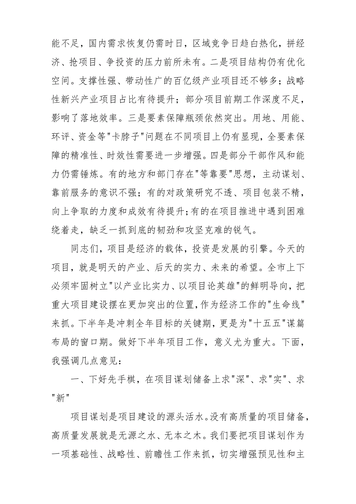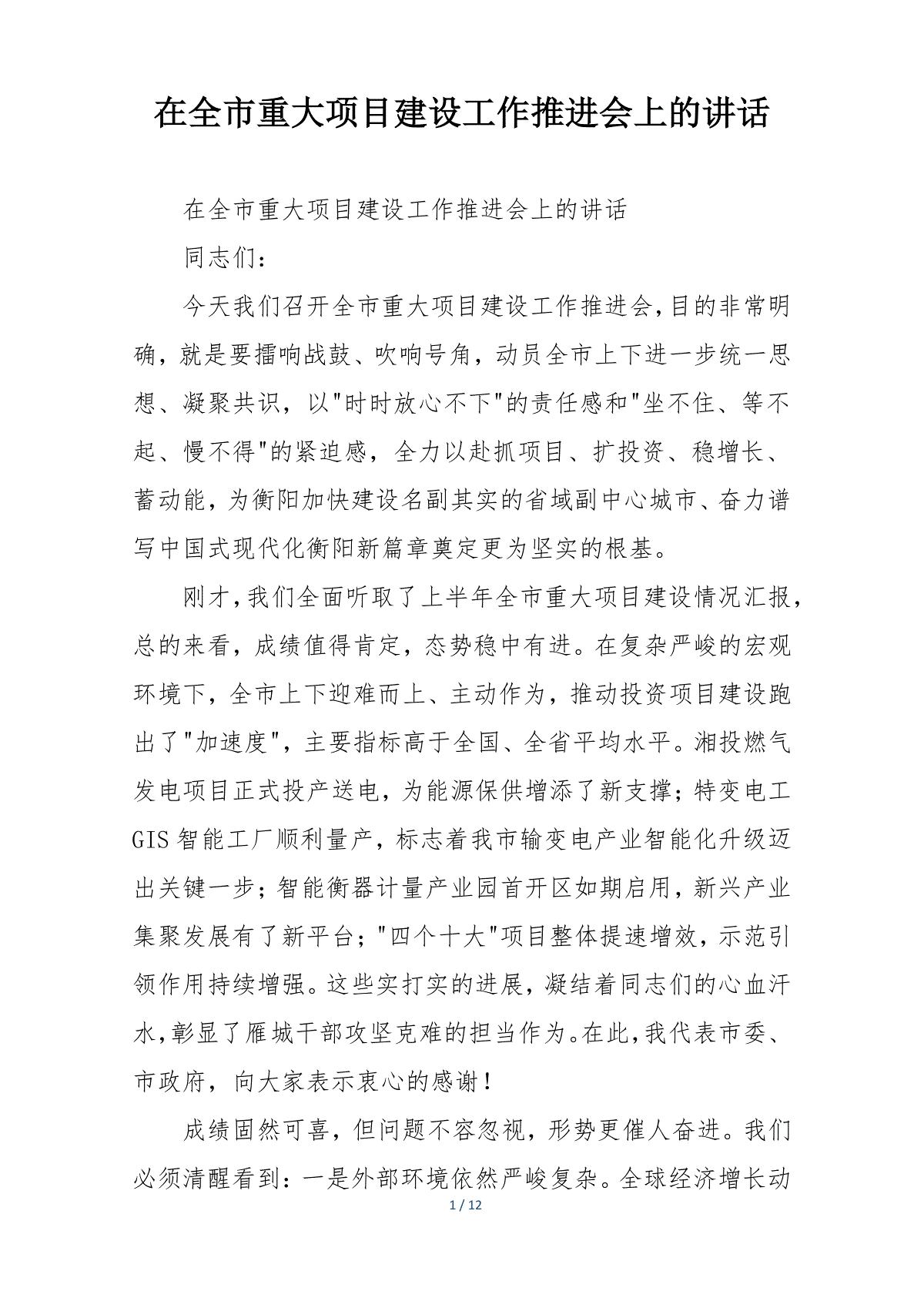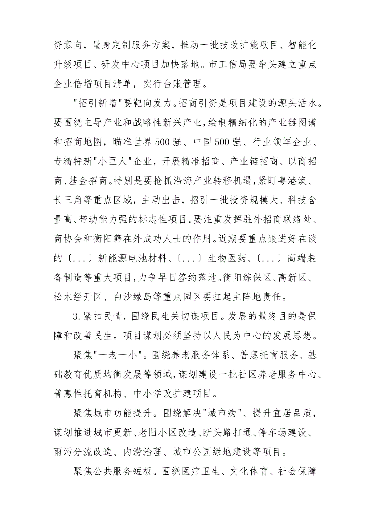 1/12在全市重大项目建设工作推进会上的讲话在全市重大项目建设工作推进会上的讲话同志们:今天我们召开全市重大项目建设工作推进会,目的非常明确,就是要擂响战鼓、吹响号角,动员全市上下进一步统一思想、凝聚共识,以时时放心不下的责任感和坐不住、等不起、慢不得的紧迫感,全力以赴抓项目、扩投资、稳增长、蓄动能,为衡阳加快建设名副其实的省域副中心城市、奋力谱写中国式现代化衡阳新篇章奠定更为坚实的根基。刚才,我们全面听取了上半年全市重大项目建设情况汇报,总的来看,成绩值得肯定,态势稳中有进。在复杂严峻的宏观环境下,全市上下迎难而上、主动作为,推动投资项目建设跑出了加速度,主要指标高于全国、全省平均水平。湘投燃气发电项目正式投产送电,为能源保供增添了新支撑;特变电工GIS智能工厂顺利量产,标志着我市输变电产业智能化升级迈出关键一步;智能衡器计量产业园首开区如期启用,新兴产业集聚发展有了新平台;四个十大项目整体提速增效,示范引领作用持续增强。这些实打实的进展,凝结着同志们的心血汗水,彰显了雁城干部攻坚克难的担当作为。在此,我代表市委、市政府,向大家表示衷心的感谢!成绩固然可喜,但问题不容忽视,形势更催人奋进。我们必须清醒看到:一是外部环境依然严峻复杂。全球经济增长动能不足,国内需求恢复仍需时日,区域竞争日趋白热化,拼经济、抢项目、争投资的压力前所未有。二是项目结构仍有优化空间。支撑性强、带动性广的百亿级产业项目还不够多;战略性新兴产业项目占比有待提升;部分项目前期工作深度不足,影响了落地效率。三是要素保障瓶颈依然突出。用地、用能、环评、资金等卡脖子问题在不同项目上仍有显现,全要素保障的精准性、时效性需要进一步增强。四是部分干部作风和能力仍需锤炼。有的地方和部门存在等靠要思想,主动谋划、靠前服务的意识不强;有的对政策研究不透、项目包装不精,向上争取的力度和成效有待提升;有的在项目推进中遇到困难绕着走,缺乏一抓到底的韧劲和攻坚克难的锐气。同志们,项目是经济的载体,投资是发展的引擎。今天的项目,就是明天的产业、后天的实力、未来的希望。全市上下必须牢固树立以产业比实力、以项目论英雄的鲜明导向,把重大项目建设摆在更加突出的位置,作为经济工作的生命线来抓。下半年是冲刺全年目标的关键期,更是为十五五谋篇布局的窗口期。做好下半年项目工作,意义尤为重大。下面,我强调几点意见:一、下好先手棋,在项目谋划储备上求深、求实、求新项目谋划是项目建设的源头活水。没有高质量的项目储备,高质量发展就是无源之水、无本之木。我们要把项目谋划作为一项基础性、战略性、前瞻性工作来抓,切实增强预见性和主3/12动性。1.吃透上情,精准对接政策谋项目。要时刻关注国家宏观政策导向、产业政策调整、投资政策变化,特别是中央预算内投资、地方政府专项债券、超长期特别国债、政策性开发性金融工具等资金投向。发改、财政、自然资源、生态环境等部门要组建政策研究专班,第一时间解读、第一时间响应、第一时间对接。要聚焦国家重大战略在衡阳的落地转化,围绕双碳目标、中部地区高质量发展、长江经济带发展、粤港澳大湾区建设等,找准衡阳的契合点和发力点,精心谋划包装一批符合政策要求、能够获得支持的重大项目。比如,湘江中下游生态保护修复、洞庭湖区域水资源配置、国家物流枢纽承载城市建设、独立储能电站、城市更新等领域,都是政策富矿,要深挖细掘。2.立足市情,聚焦优势产业谋项目。衡阳最大的优势在产业,最大的潜力也在产业。项目谋划必须紧紧围绕构建现代化产业体系这个核心。原地倍增要深挖潜力。服务好现有企业就是最好的招商引资。要聚焦一核两电三色四新优势产业(以输变电产业为核心,电气装备、电子信息,盐卤化工、钢管及深加工、有色金属,新材料、新能源、新医药、新建材),深入实施原地倍增计划。鼓励和支持特变电工、建滔化工、水口山集团、衡钢、比亚迪、瑞达电源等龙头企业增资扩产、技术改造、延链补链强链。要一个企业一个企业去对接,了解其发展规划和投资意向,量身定制服务方案,推动一批技改扩能项目、智能化升级项目、研发中心项目加快落地。市工信局要牵头建立重点企业倍增项目清单,实行台账管理。招引新增要靶向发力。招商引资是项目建设的源头活水。要围绕主导产业和战略性新兴产业,绘制精细化的产业链图谱和招商地图,瞄准世界500强、中国500强、行业领军企业、专精特新小巨人企业,开展精准招商、产业链招商、以商招商、基金招商。特别是要抢抓沿海产业转移机遇,紧盯粤港澳、长三角等重点区域,主动出击,招引一批投资规模大、科技含量高、带动能力强的标志性项目。要注重发挥驻外招商联络处、商协会和衡阳籍在外成功人士的作用。近期要重点跟进好在谈的〔...〕新能源电池材料、〔...〕生物医药、〔...〕高端装备制造等重大项目,力争早日签约落地。衡阳综保区、高新区、松木经开区、白沙绿岛等重点园区要扛起主阵地责任。3.紧扣民情,围绕民生关切谋项目。发展的最终目的是保障和改善民生。项目谋划必须坚持以人民为中心的发展思想。聚焦一老一小。围绕养