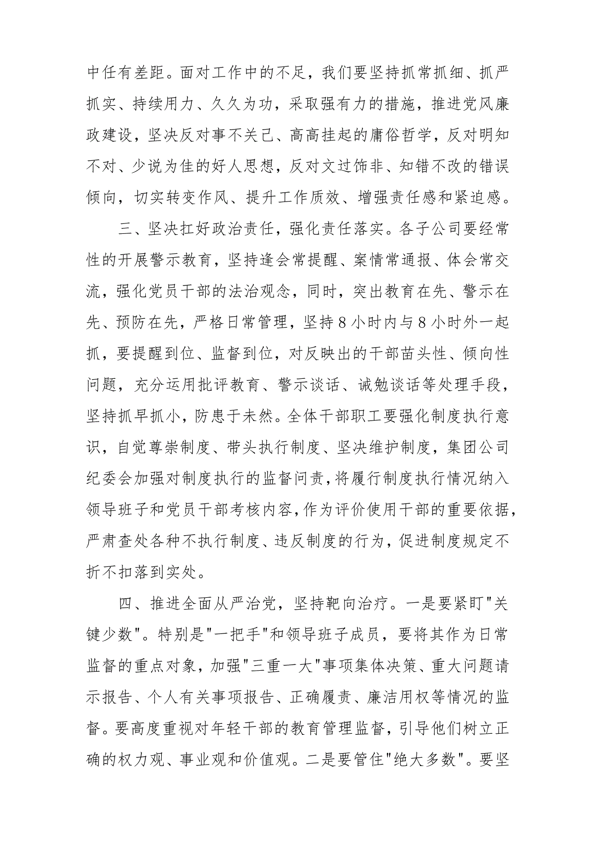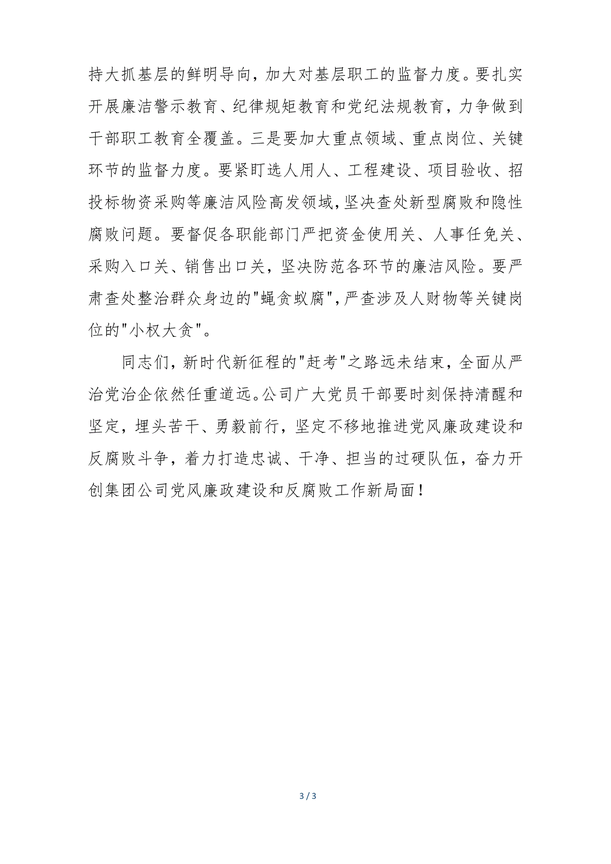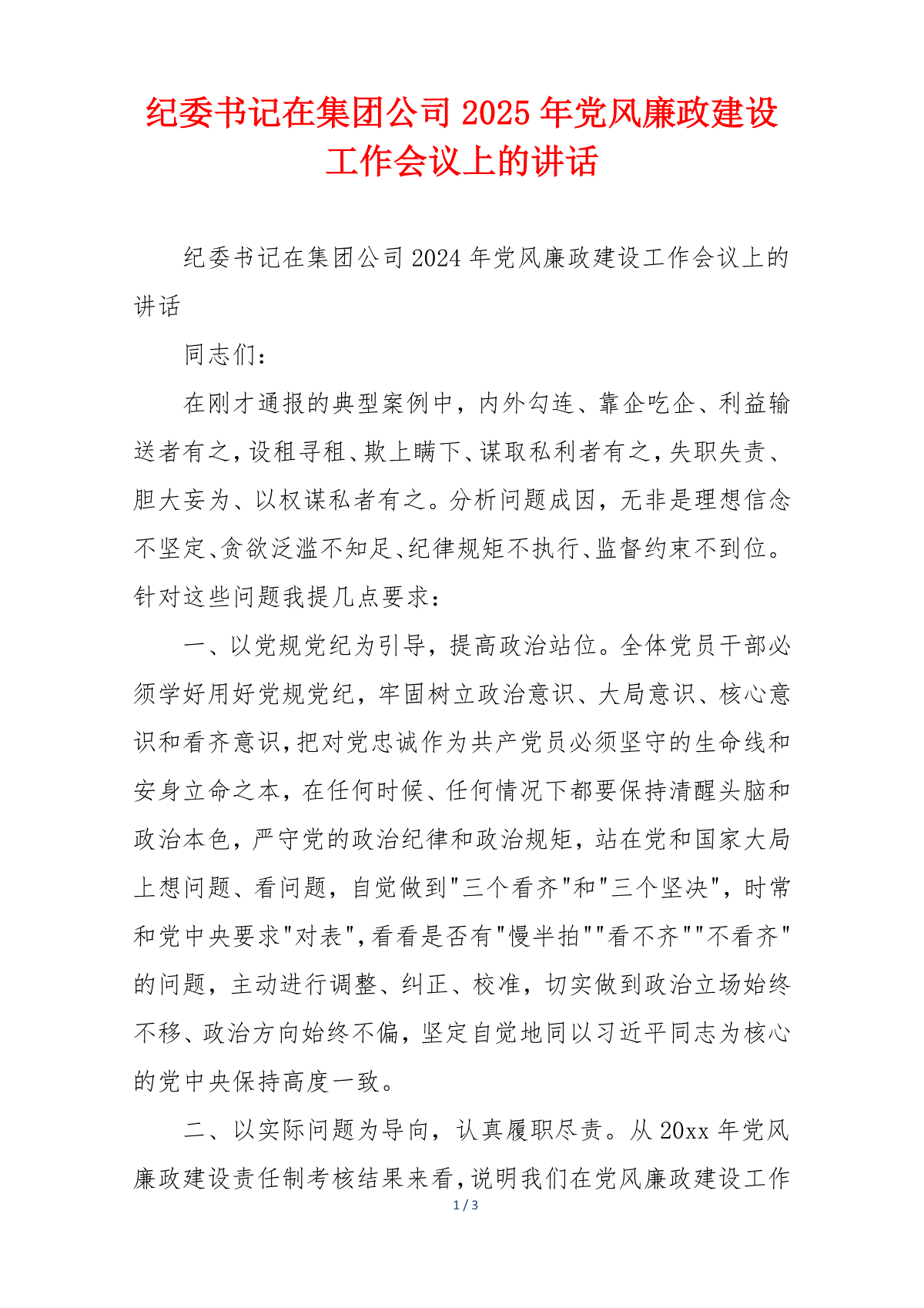 1/3纪委书记在集团公司2025年党风廉政建设工作会议上的讲话纪委书记在集团公司2024年党风廉政建设工作会议上的讲话同志们:在刚才通报的典型案例中,内外勾连、靠企吃企、利益输送者有之,设租寻租、欺上瞒下、谋取私利者有之,失职失责、胆大妄为、以权谋私者有之。分析问题成因,无非是理想信念不坚定、贪欲泛滥不知足、纪律规矩不执行、监督约束不到位。针对这些问题我提几点要求:一、以党规党纪为引导,提高政治站位。全体党员干部必须学好用好党规党纪,牢固树立政治意识、大局意识、核心意识和看齐意识,把对党忠诚作为共产党员必须坚守的生命线和安身立命之本,在任何时候、任何情况下都要保持清醒头脑和政治本色,严守党的政治纪律和政治规矩,站在党和国家大局上想问题、看问题,自觉做到三个看齐和三个坚决,时常和党中央要求对表,看看是否有慢半拍看不齐不看齐的问题,主动进行调整、纠正、校准,切实做到政治立场始终不移、政治方向始终不偏,坚定自觉地同以习近平同志为核心的党中央保持高度一致。二、以实际问题为导向,认真履职尽责。从20xx年党风廉政建设责任制考核结果来看,说明我们在党风廉政建设工作中任有差距。面对工作中的不足,我们要坚持抓常抓细、抓严抓实、持续用力、久久为功,采取强有力的措施,推进党风廉政建设,坚决反对事不关己、高高挂起的庸俗哲学,反对明知不对、少说为佳的好人思想,反对文过饰非、知错不改的错误倾向,切实转变作风、提升工作质效、增强责任感和紧迫感。三、坚决扛好政治责任,强化责任落实。各子公司要经常性的开展警示教育,坚持逢会常提醒、案情常通报、体会常交流,强化党员干部的法治观念,同时,突出教育在先、警示在先、预防在先,严格日常管理,坚持8小时内与8小时外一起抓,要提醒到位、监督到位,对反映出的干部苗头性、倾向性问题,充分运用批评教育、警示谈话、诫勉谈话等处理手段,坚持抓早抓小,防患于未然。全体干部职工要强化制度执行意识,自觉尊崇制度、带头执行制度、坚决维护制度,集团公司纪委会加强对制度执行的监督问责,将履行制度执行情况纳入领导班子和党员干部考核内容,作为评价使用干部的重要依据,严肃查处各种不执行制度、违反制度的行为,促进制度规定不折不扣落到实处。四、推进全面从严治党,坚持靶向治疗。一是要紧盯关键少数。特别是一把手和领导班子成员,要将其作为日常监督的重点对象,加强三重一大事项集体决策、重大问题请示报告、个人有关事项报告、正确履责、廉洁用权等情况的监督。要高度重视对年轻干部的教育管理监督,引导他们树立正确的权力观、事业观和价值观。二是要管住绝大多数。要坚3/3持大抓基层的鲜明导向,加大对基层职工的监督力度。要扎实开展廉洁警示教育、纪律规矩教育和党纪法规教育,力争做到干部职工教育全覆盖。三是要加大重点领域、重点岗位、关键环节的监督力度。要紧盯选人用人、工程建设、项目验收、招投标物资采购等廉洁风险高发领域,坚决查处新型腐败和隐性腐败问题。要督促各职能部门严把资金使用关、人事任免关、采购入口关、销售出口关,坚决防范各环节的廉洁风险。要严肃查处整治群众身边的蝇贪蚁腐,严查涉及人财物等关键岗位的小权大贪。同志们,新时代新征程的赶考之路远未结束,全面从严治党治企依然任重道远。公司广大党员干部要时刻保持清醒和坚定,埋头苦干、勇毅前行,坚定不移地推进党风廉政建设和反腐败斗争,着力打造忠诚、干净、担当的过硬队伍,奋力开创集团公司党风廉政建设和反腐败工作新局面!