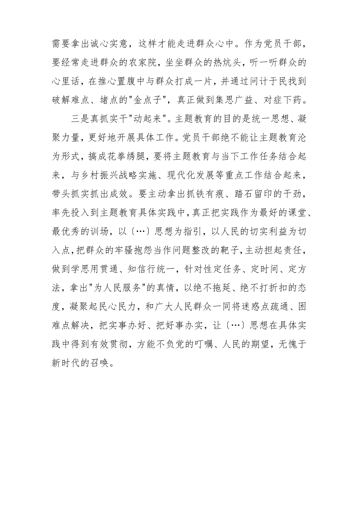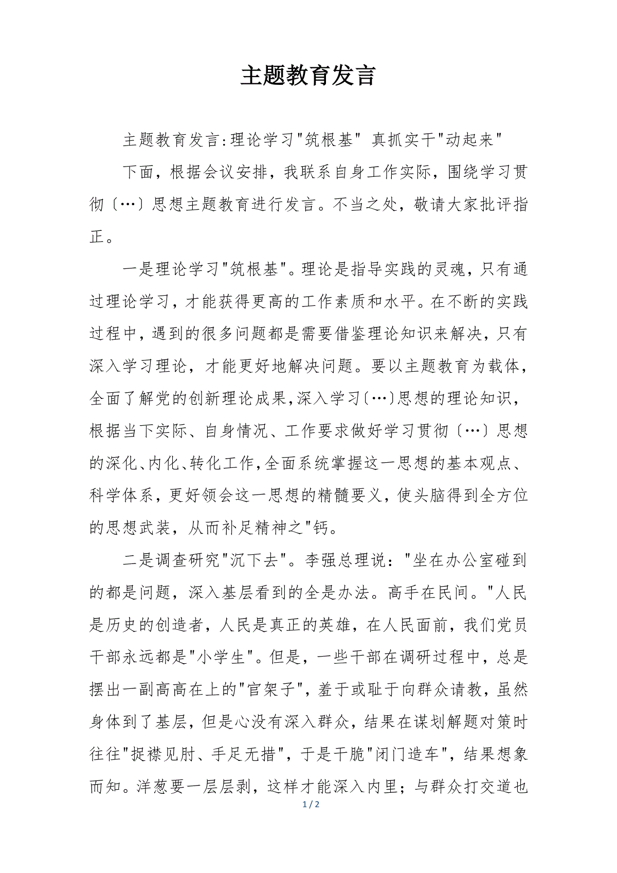 1/2主题教育发言主题教育发言:理论学习筑根基真抓实干动起来下面,根据会议安排,我联系自身工作实际,围绕学习贯彻〔…〕思想主题教育进行发言。不当之处,敬请大家批评指正。一是理论学习筑根基。理论是指导实践的灵魂,只有通过理论学习,才能获得更高的工作素质和水平。在不断的实践过程中,遇到的很多问题都是需要借鉴理论知识来解决,只有深入学习理论,才能更好地解决问题。要以主题教育为载体,全面了解党的创新理论成果,深入学习〔…〕思想的理论知识,根据当下实际、自身情况、工作要求做好学习贯彻〔…〕思想的深化、内化、转化工作,全面系统掌握这一思想的基本观点、科学体系,更好领会这一思想的精髓要义,使头脑得到全方位的思想武装,从而补足精神之钙。二是调查研究沉下去。李强总理说:坐在办公室碰到的都是问题,深入基层看到的全是办法。高手在民间。人民是历史的创造者,人民是真正的英雄,在人民面前,我们党员干部永远都是小学生。但是,一些干部在调研过程中,总是摆出一副高高在上的官架子,羞于或耻于向群众请教,虽然身体到了基层,但是心没有深入群众,结果在谋划解题对策时往往捉襟见肘、手足无措,于是干脆闭门造车,结果想象而知。洋葱要一层层剥,这样才能深入内里;与群众打交道也需要拿出诚心实意,这样才能走进群众心中。作为党员干部,要经常走进群众的农家院,坐坐群众的热炕头,听一听群众的心里话,在推心置腹中与群众打成一片,并通过问计于民找到破解难点、堵点的金点子,真正做到集思广益、对症下药。三是真抓实干动起来。主题教育的目的是统一思想、凝聚力量,更好地开展具体工作。党员干部绝不能让主题教育沦为形式,搞成花拳绣腿,要将主题教育与当下工作任务结合起来,与乡村振兴战略实施、现代化发展等重点工作结合起来,带头抓实抓出成效。要主动拿出抓铁有痕、踏石留印的干劲,率先投入到主题教育具体实践中,真正把实践作为最好的课堂、最优秀的训场,以〔…〕思想为指引,以人民的切实利益为切入点,把群众的牢骚抱怨当作问题整改的靶子,主动担起责任,做到学思用贯通、知信行统一,针对性定任务、定时间、定方法,拿出为人民服务的真情,以绝不拖延、绝不打折扣的态度,凝聚起民心民力,和广大人民群众一同将迷惑点疏通、困难点解决,把实事办好、把好事办实,让〔…〕思想在具体实践中得到有效贯彻,方能不负党的叮嘱、人民的期望,无愧于新时代的召唤。