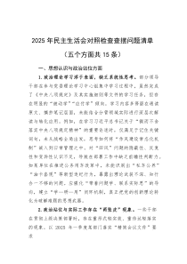 从思想认识、工作作风、廉洁自律等方面深入查找不足,如何进一步提升?以下由网友整理分享的“2025年民主生活会对照检查查摆问题清单(五个方面共15条)”相关材料,便您学习参考,喜欢就分享给朋友吧!