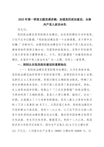 加强党的政治建设,提高政治判断力、领悟力、执行力,坚定理想信念,永葆共产党人政治本色。下面是网友整理编辑的2025年第一季度主题党课讲稿:加强党的政治建设,永葆共产党人政治本色(优秀范例)相关范文,供大家参考学习,喜欢就下载支持!