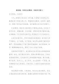 红岩精神象征着坚韧不拔与无私奉献,新时代青年应继承这一宝贵精神财富,勇担使命,积极进取,为实现中华民族伟大复兴贡献力量。下面是小编为您整理的演讲稿传承红岩精神争做时代新人范例,仅供参考,希望对您有所帮助。