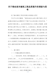 提升建筑工程品质需加强监管完善标准强化企业责任意识提高技术水平严格质量控制。以下是阿拉网友分享的“关于推动某市建筑工程品质提升的调查与思考”,供您学习参考,希望有所用途!