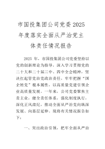 市国投集团公司党委严格履行全面从严治党主体责任,加强党风廉政建设,推动企业高质量发展。以下是小编为您整理分享的“(整理)市国投集团公司党委2025年度落实全面从严治党主体责任情况报告”相关内容,供您学习参考!