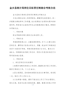 金乡县统计局通过设定岗位目标责任制,实施综合考核,旨在提升工作效率与服务质量,确保统计工作准确高效完成。下面是网友整理分享的金乡县统计局岗位目标责任制综合考核办法相关资料,供大家学习参考,喜欢就分享吧!