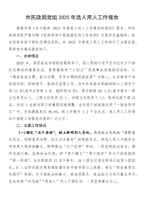 民政局党组严格遵循选人用人原则,优化队伍结构,提升整体素质,激发工作活力!以下是阿拉网友分享的“市民政局党组2025年选人用人工作报告(参考)”,供您学习参考,希望有所用途!