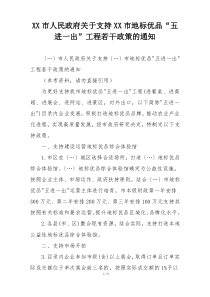 为支持地标优品发展,市政府出台政策推动产品进商超、进酒店、进景区、进学校、进机关及出口。以下是阿拉网友分享的“XX市人民政府关于支持XX市地标优品“五进一出”工程若干政策的通知”,供您学习参考,希望有所用途!