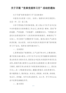 为深入学习党章党规,提高党员理论水平与党性修养,拟开展专题学习活动,具体安排如何?以下由网友整理分享的关于开展“党章党规学习月”活动的通知相关文档,供您学习参考,喜欢就分享吧!
