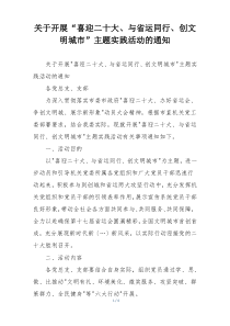 为迎接盛会,同步省运会步伐,共创文明城市,特开展相关主题实践活动。下面是网友整理分享的关于开展“喜迎二十大、与省运同行、创文明城市”主题实践活动的通知相关资料,供大家学习参考,喜欢就分享吧!