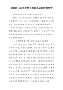 全面深化改革需强化顶层设计,统筹规划,协调推进,确保改革措施系统集成、协同高效。下面是网友整理分享的全面深化改革形势下加强顶层设计的思考相关资料,供大家学习参考,喜欢就分享吧!