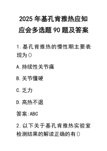 基孔肯雅热是由蚊子传播的病毒性疾病预防关键在于防蚊灭蚊加强个人防护措施减少感染风险下面是小编为您整理的(资料)2025年基孔肯雅热应知应会多选题90题及答案范例,仅供参考,希望对您有所帮助。